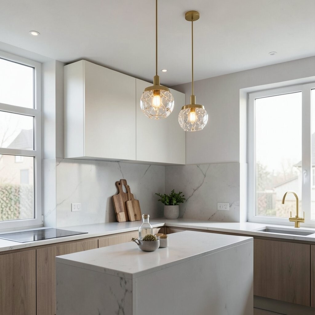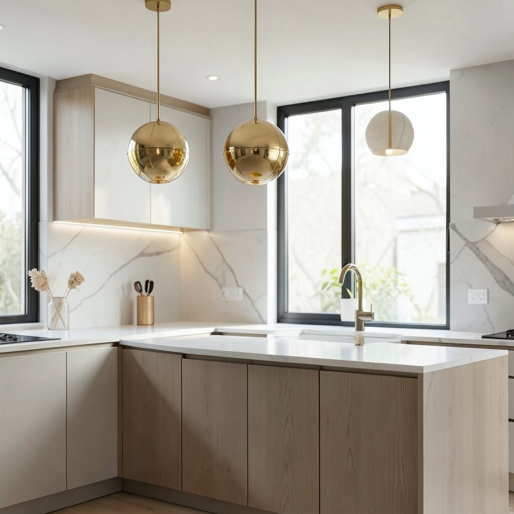 Golden globe pendants bring a celestial charm to your kitchen. Their round, smooth design softly reflects light, adding warmth to your space. These pendants are perfect for hanging over an island or dining table.