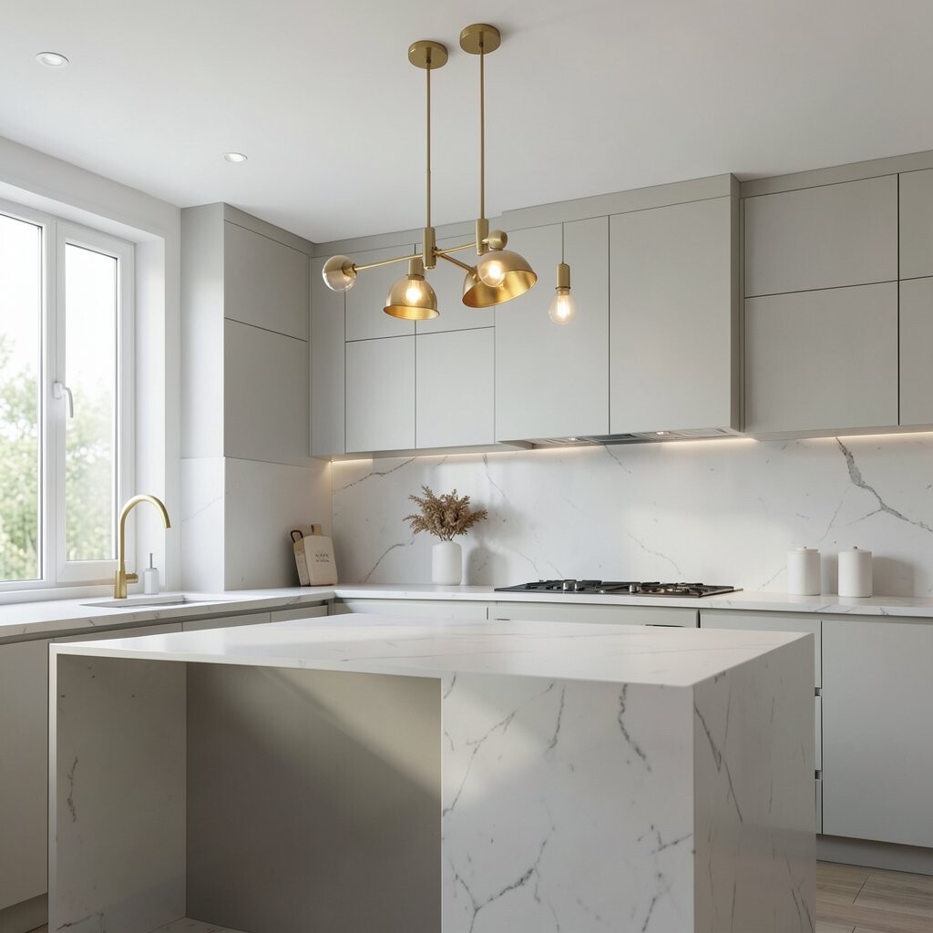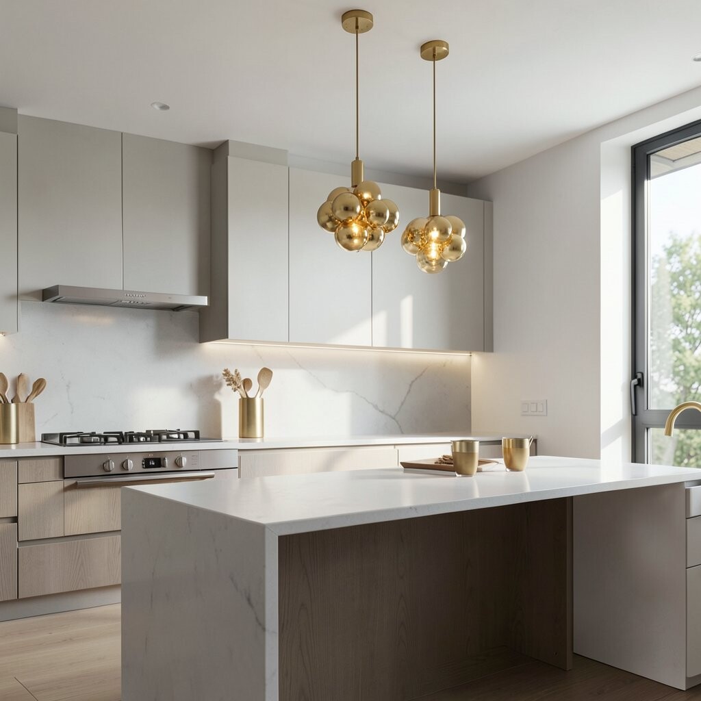 Gold cluster pendants are perfect for those who love a bold, modern look. Their multiple lights create a dynamic, eye-catching design. They’re ideal for making a statement in any kitchen.