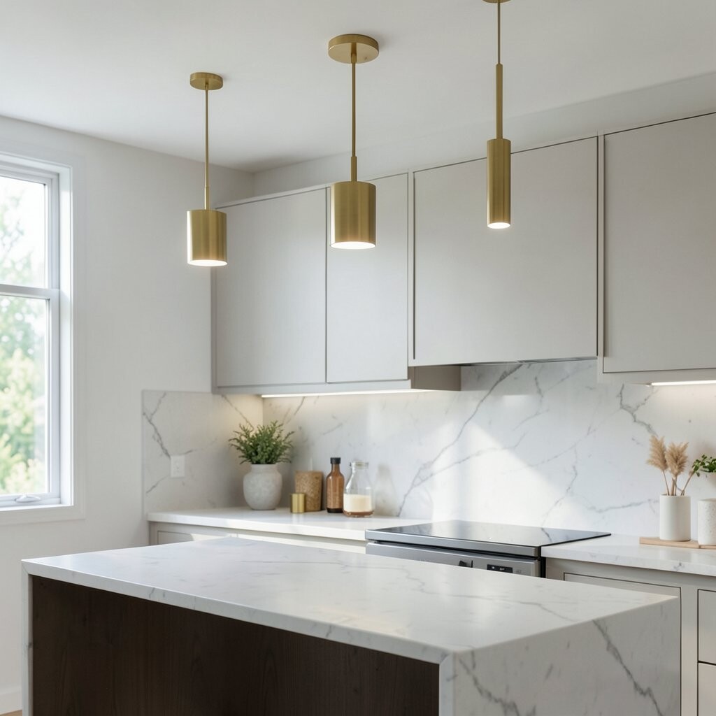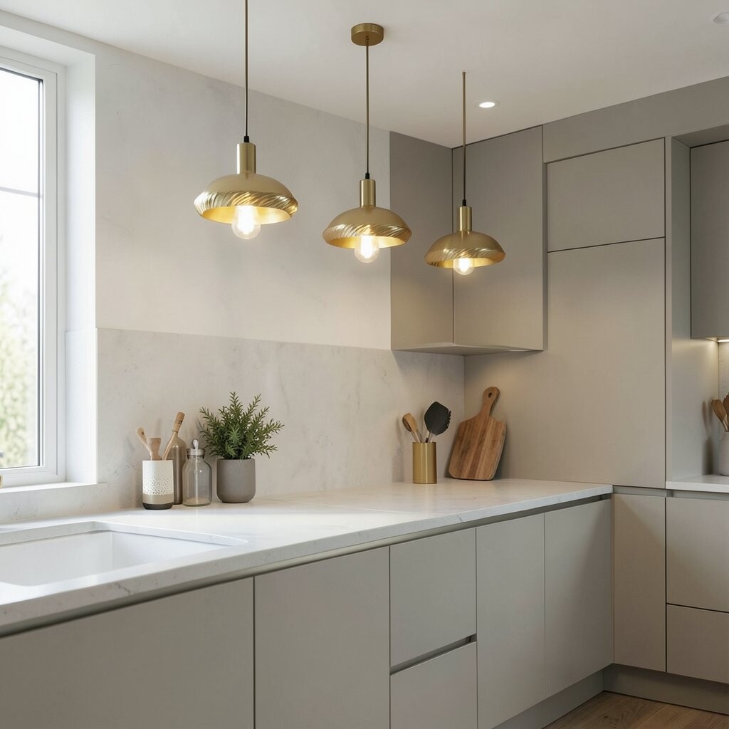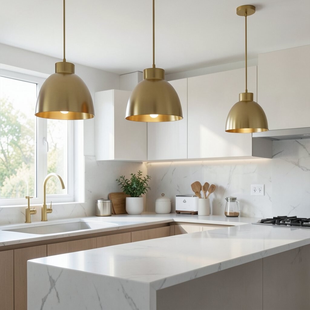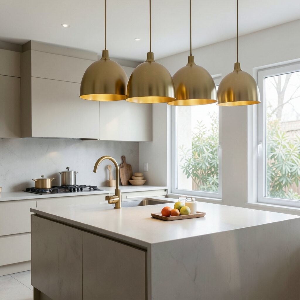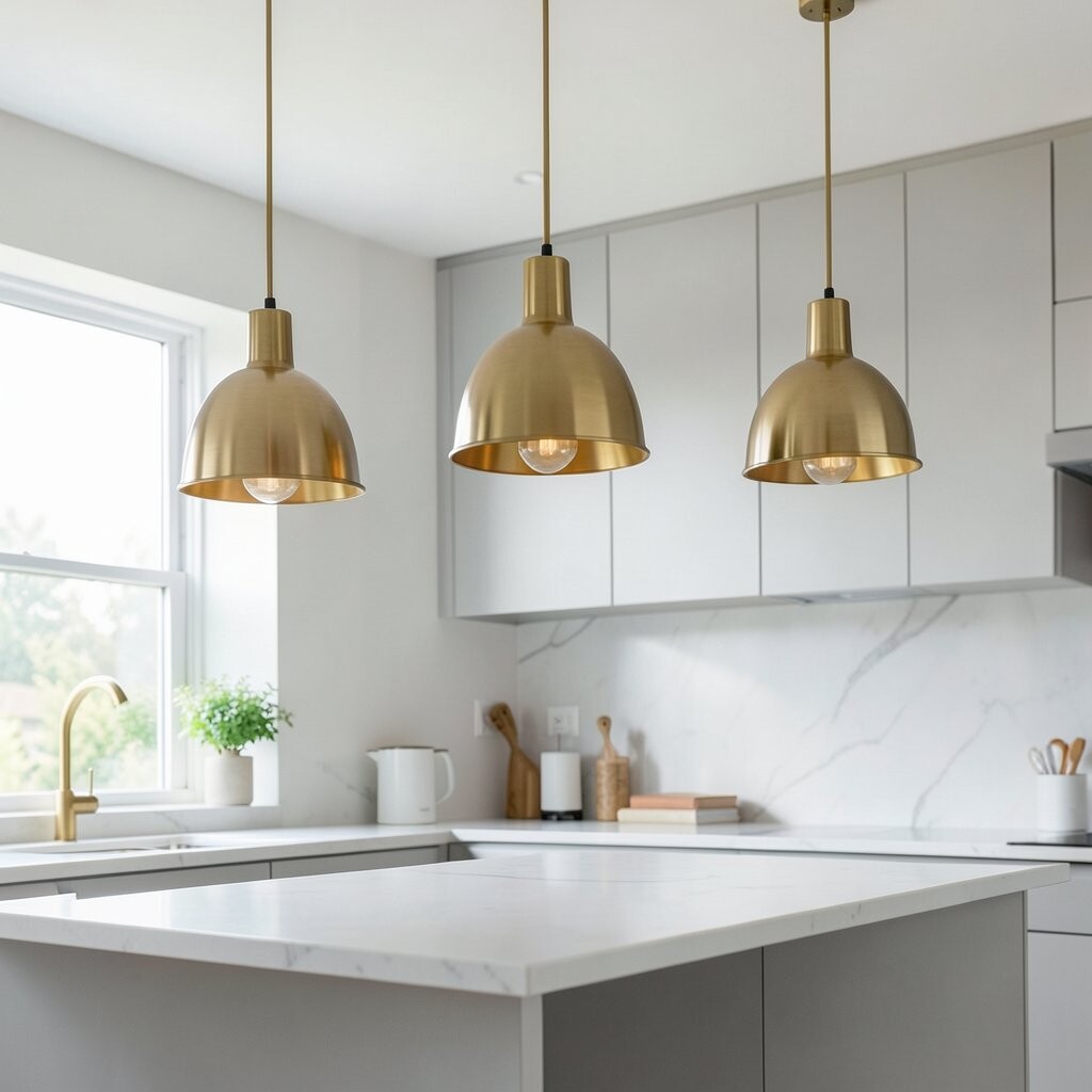 Dome-shaped gold pendants bring a classic elegance to any kitchen. Their curved design provides focused lighting, making them perfect for kitchen islands. These pendants are timeless and versatile.