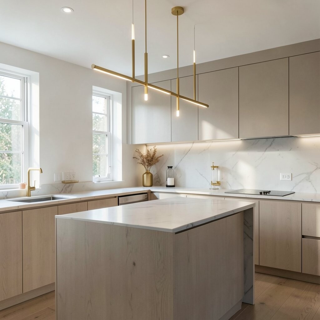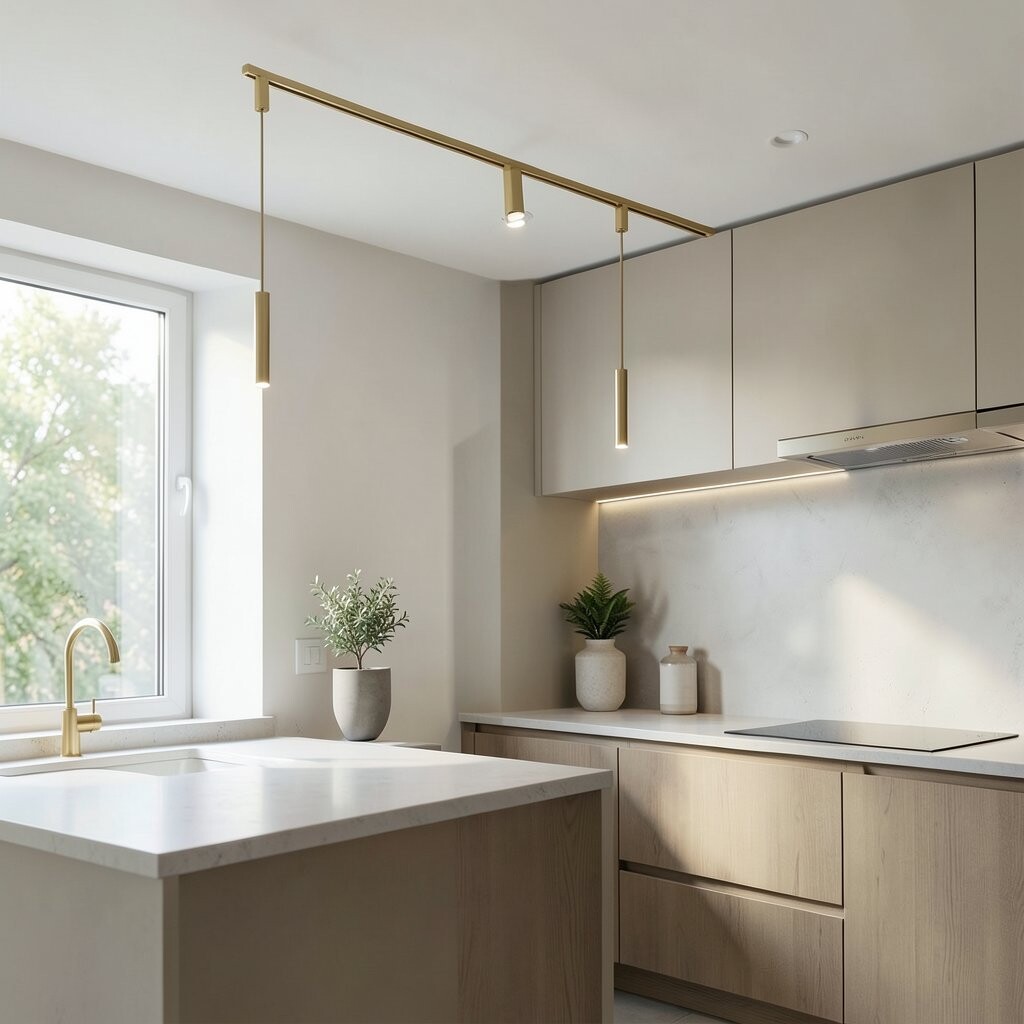 Minimalist gold track lighting is perfect for those who want flexibility. These lights can be adjusted to focus on different areas, making them ideal for highlighting kitchen features. They provide a clean, unobtrusive look.