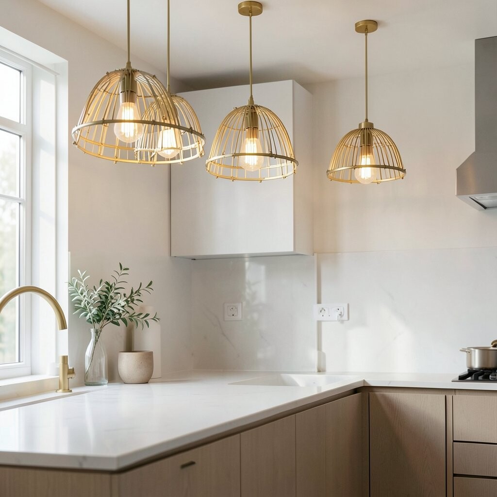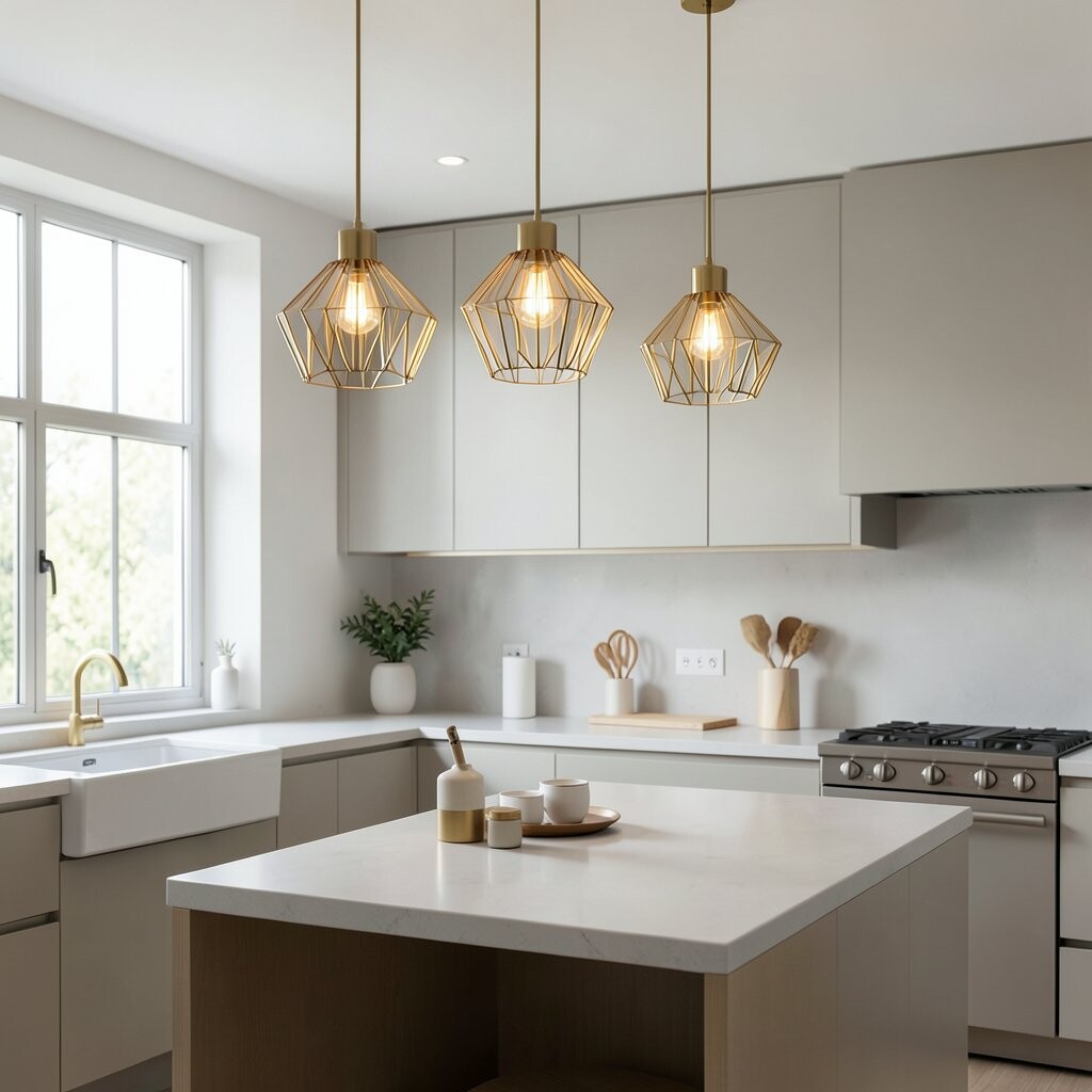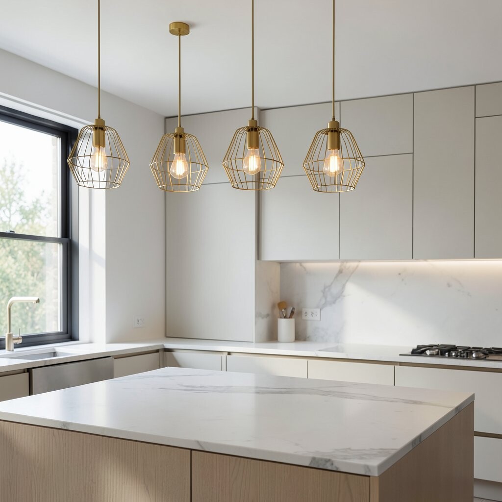 Gold cage pendants are a trendy choice for contemporary kitchens. Their open design creates interesting shadows, adding depth to your space. These pendants are perfect for making a bold statement.