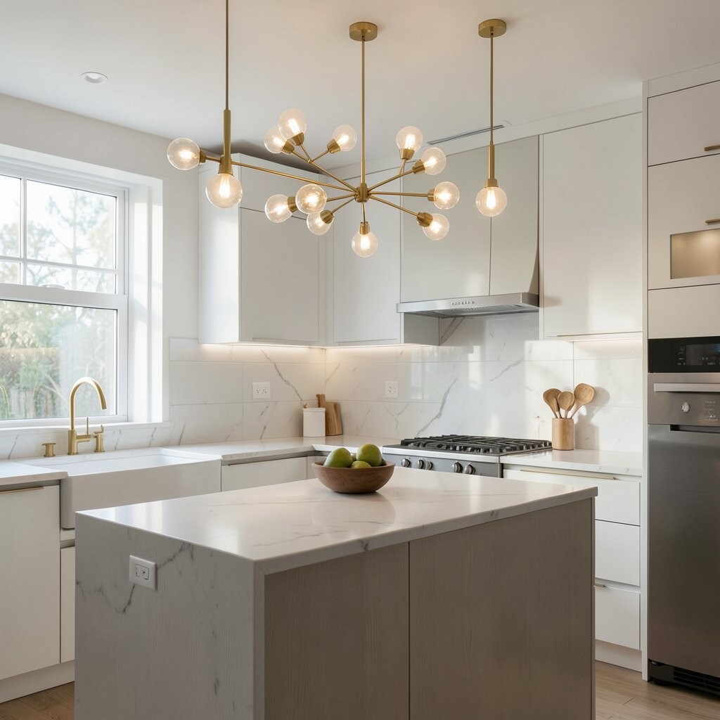 Gold sputnik chandeliers are a bold choice for modern kitchens. Their starburst design creates a dynamic, eye-catching look. They’re perfect for those who love mid-century modern styles.