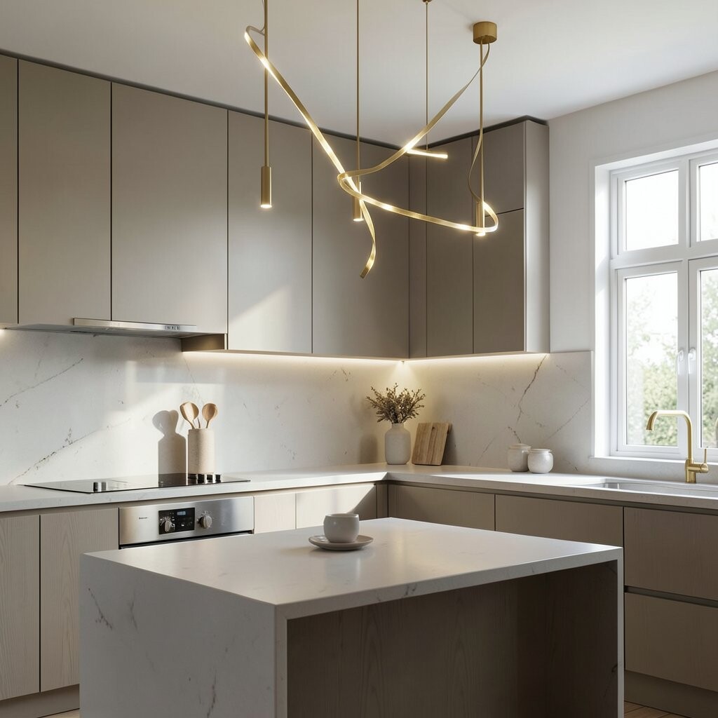 Gold ribbon lights offer a unique, artistic look for any kitchen. Their flowing design creates an intriguing play of light and shadow. They’re perfect for adding a touch of creativity to your space.