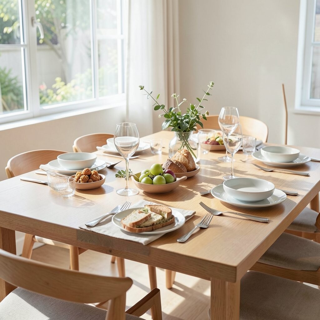 This setup is peaceful and serene. It’s perfect for a relaxing brunch. Serve green tea and light dishes.