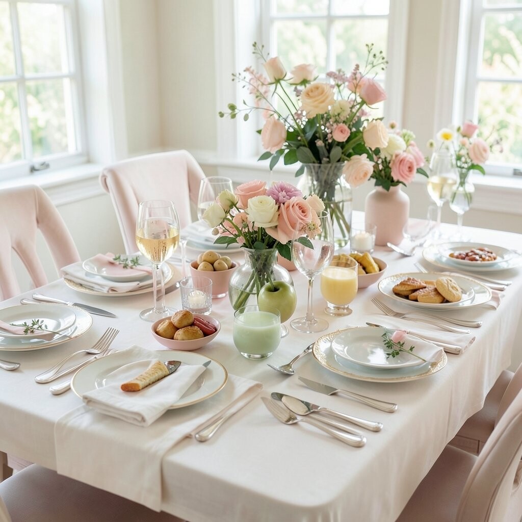 Soft pastels create a dreamy atmosphere. Think mint greens, soft pinks, and baby blues. Use pastel dishes and floral arrangements.