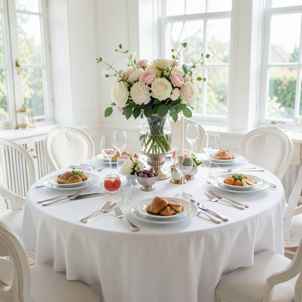 White tablecloths, white plates, and white flowers create a serene setting. An all-white table setting is timeless and elegant. Add silver cutlery for a touch of sophistication.