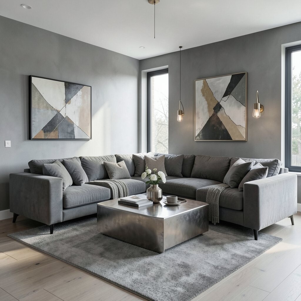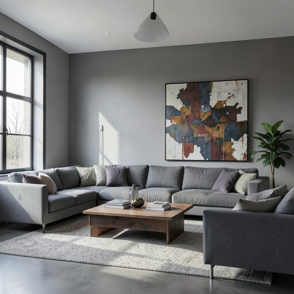 Big, bold art pieces can make your living room stand out. Choose industrial themes like cityscapes or abstract works in gray tones.