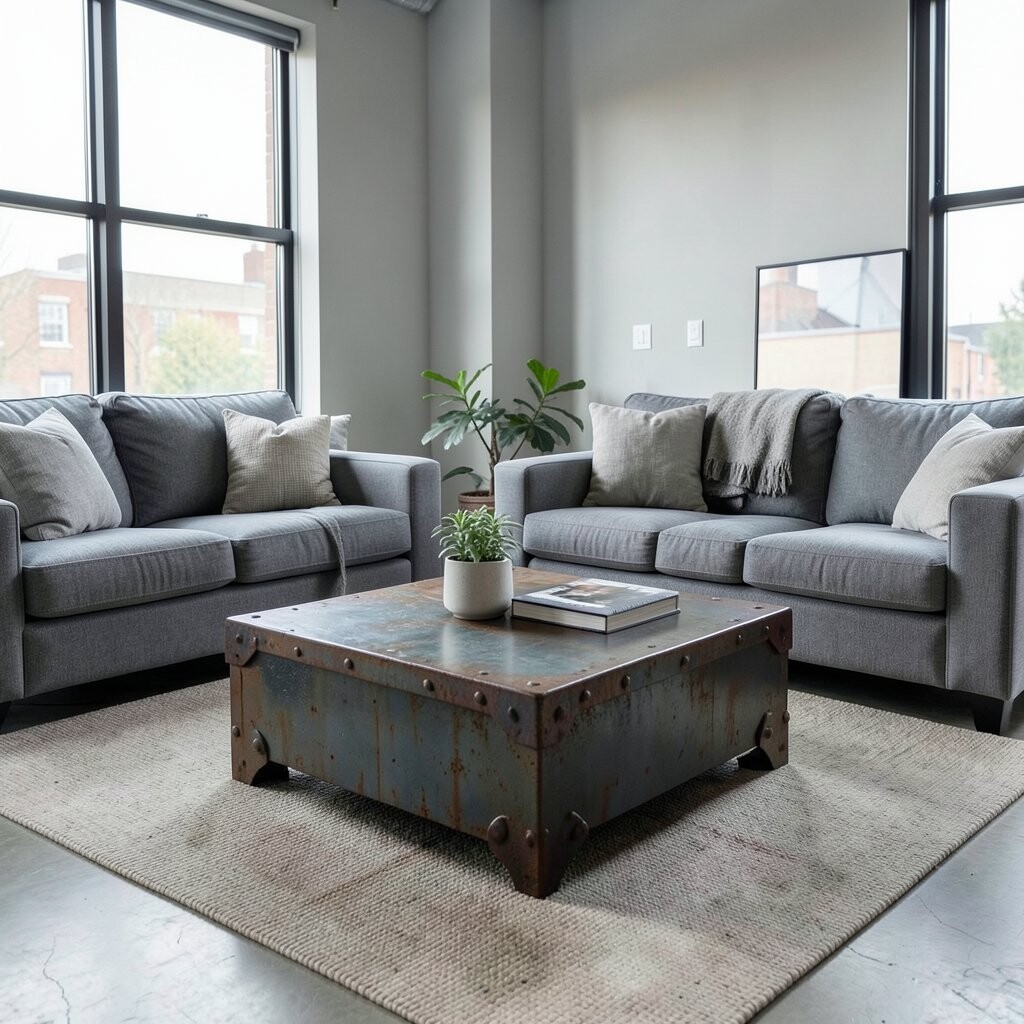 An industrial coffee table with metal and wood elements can be a stunning centerpiece. It ties the room together with its functional charm.