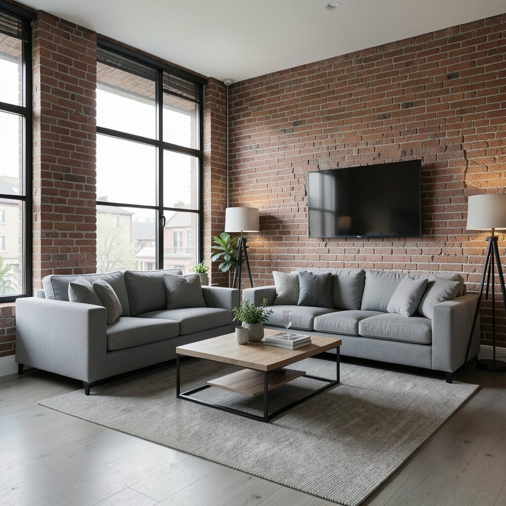 Exposed brick walls are a hallmark of industrial design. They add warmth and texture to the cool grays in your living room. It’s like having a piece of history right in your home!
