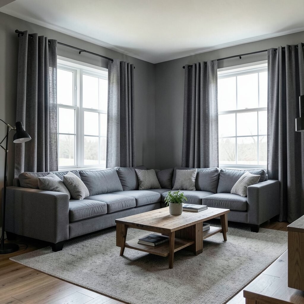 Opt for gray industrial curtains to complement the theme. Look for heavy fabrics with a subtle weave or pattern.