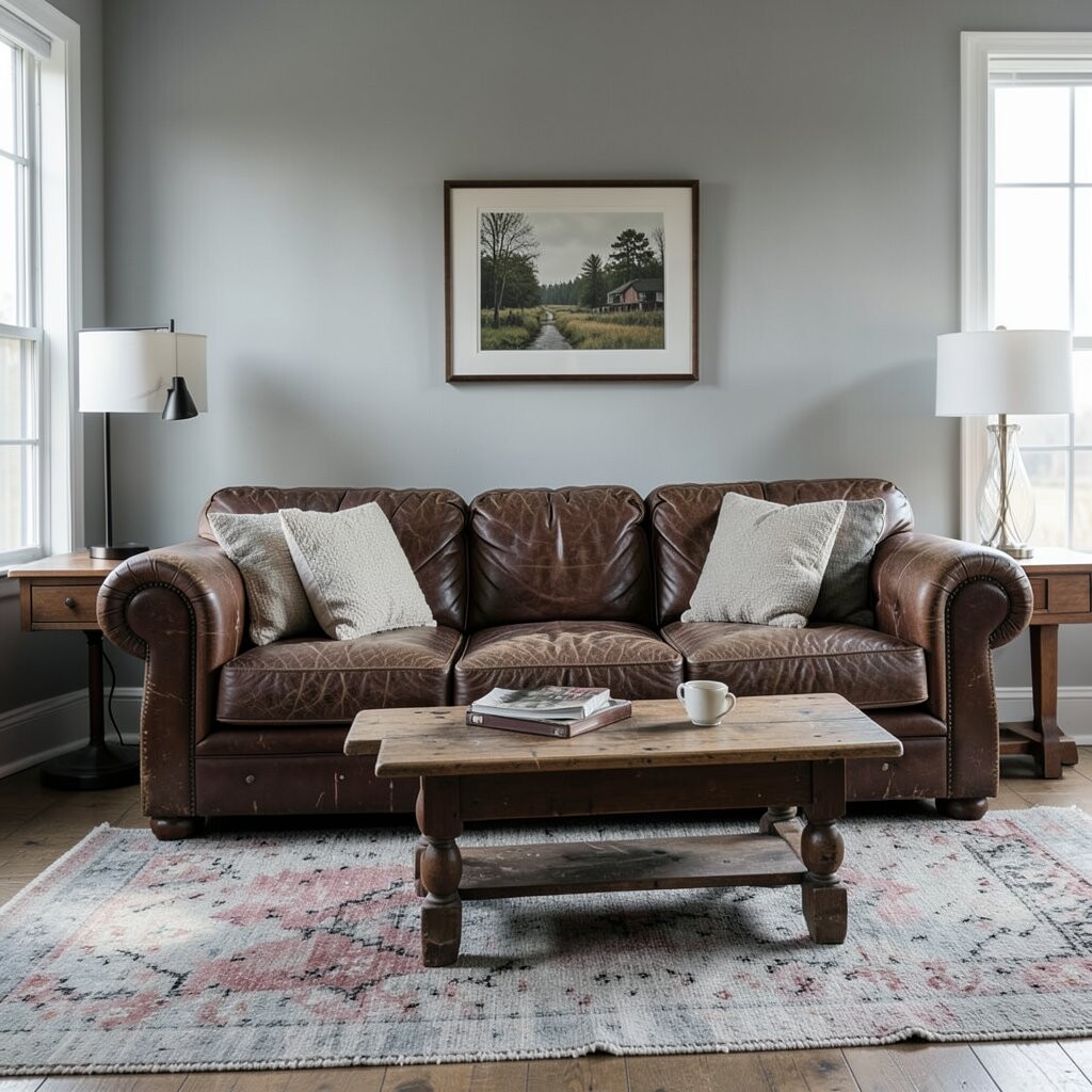 A vintage leather sofa is a timeless choice that adds sophistication to your space. The rich texture and color contrast beautifully with gray walls.