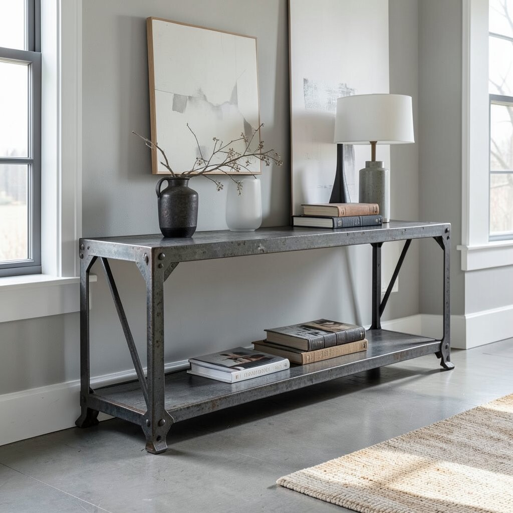 An industrial console table can be a versatile addition. Use it as a display area or for extra storage.