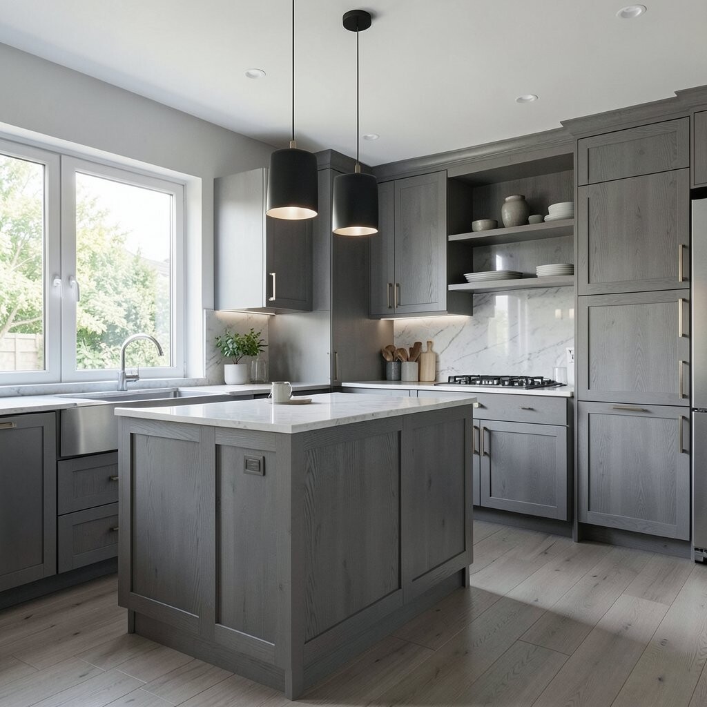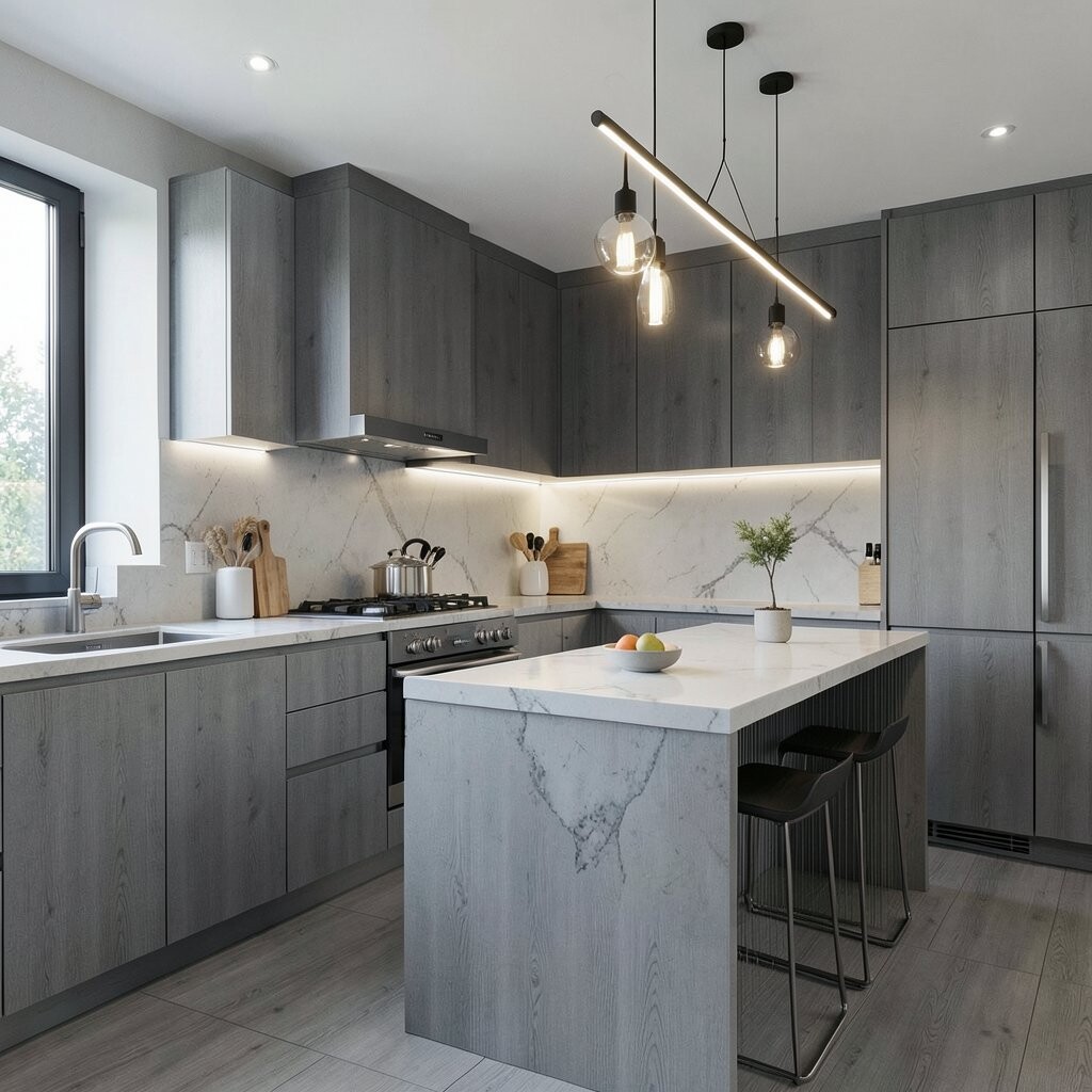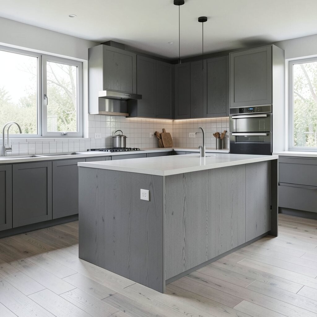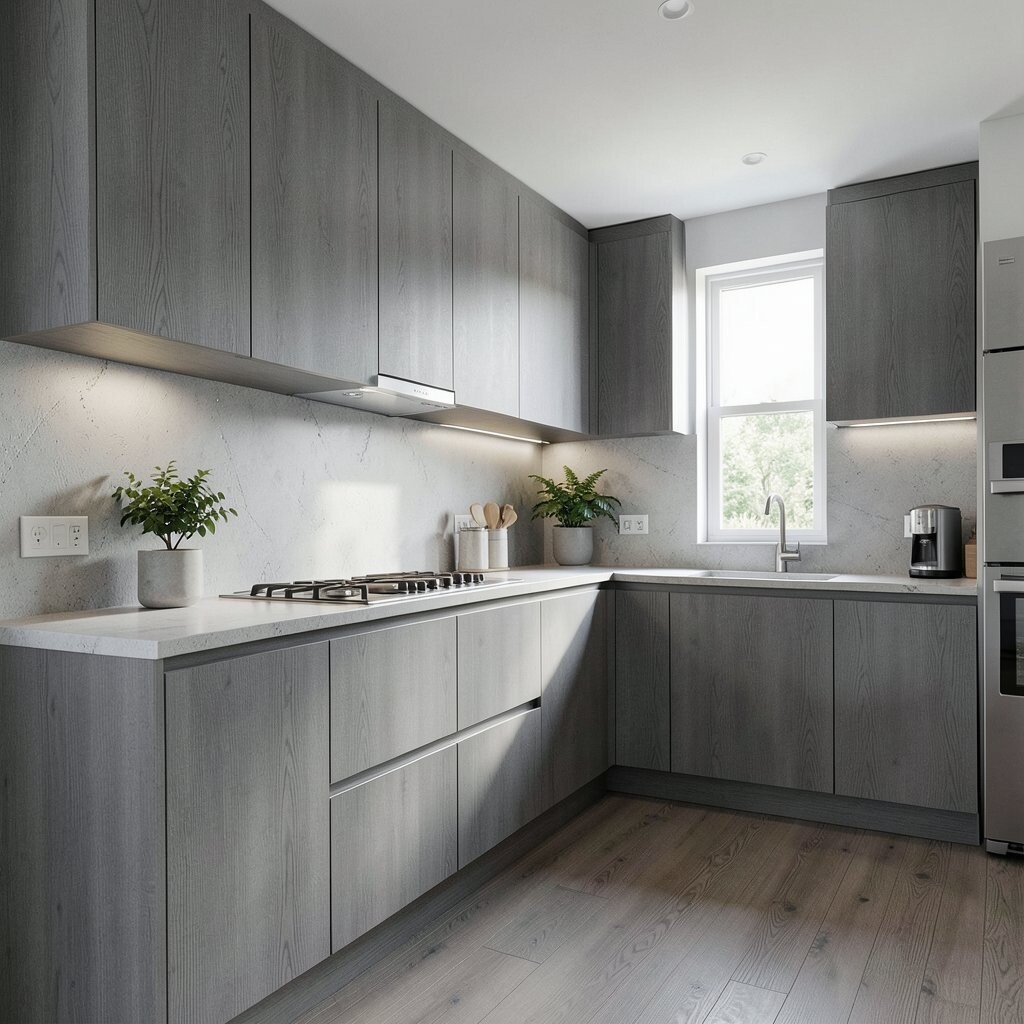 For a sleek and modern kitchen, consider using gray wood panels. They create a streamlined appearance that feels fresh and contemporary.
