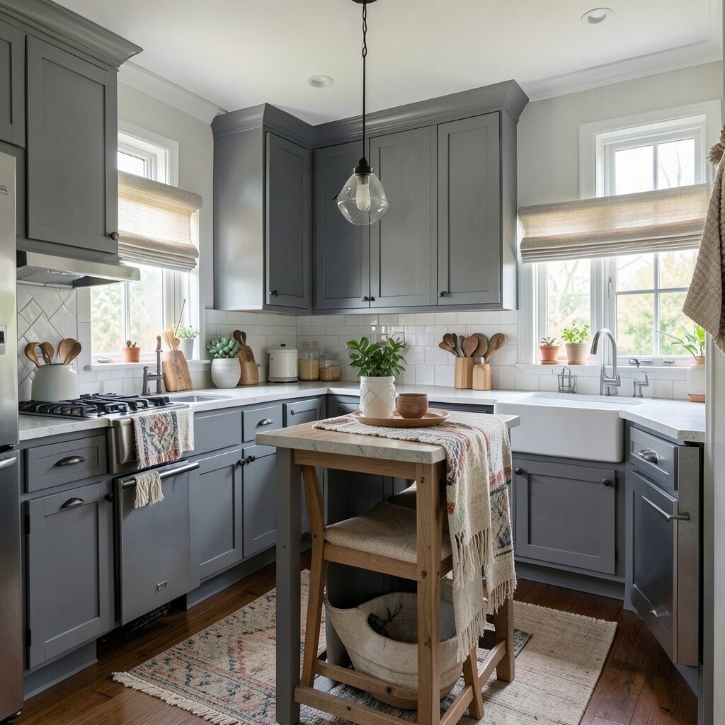 Pairing gray wood with earth tones can create a warm and cozy kitchen. Think browns, greens, and soft yellows.