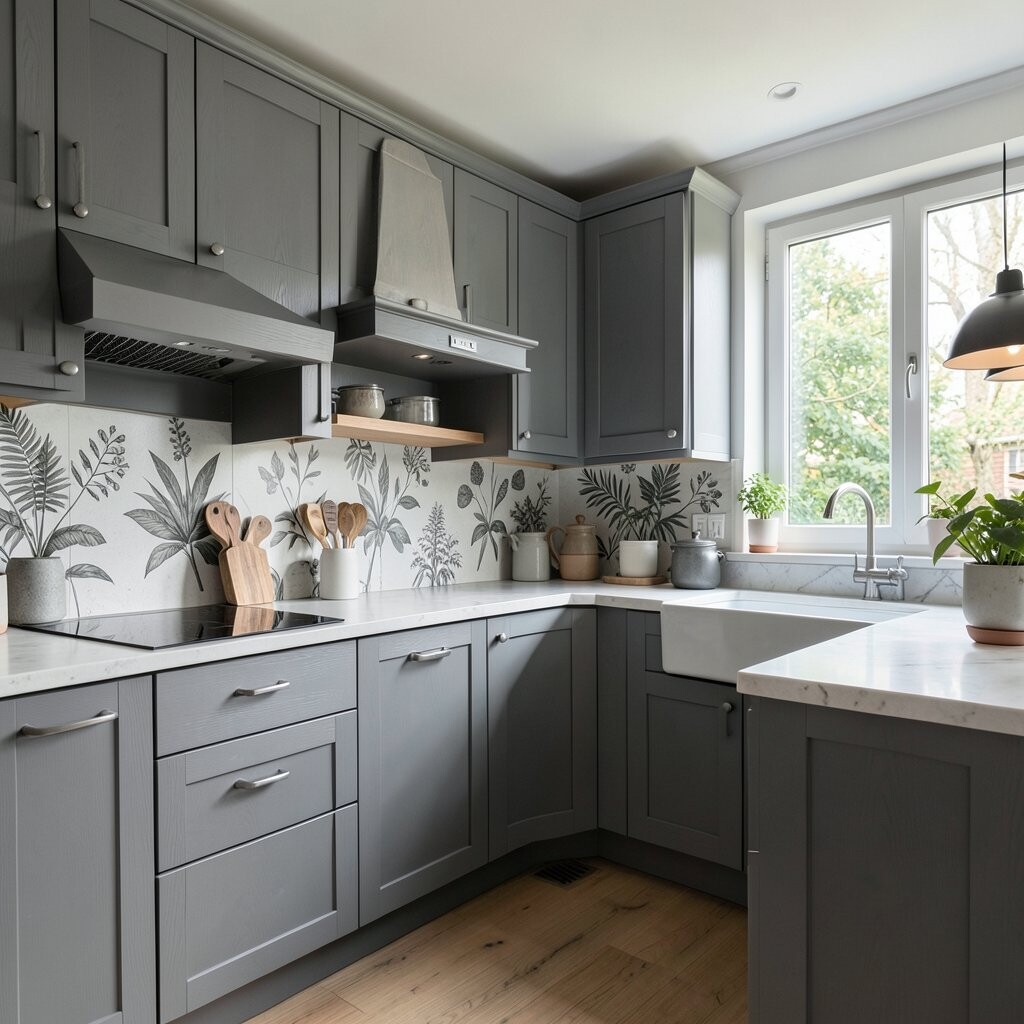 Gray wood combined with botanical prints can transform your kitchen into an urban jungle. This look is both trendy and refreshing.