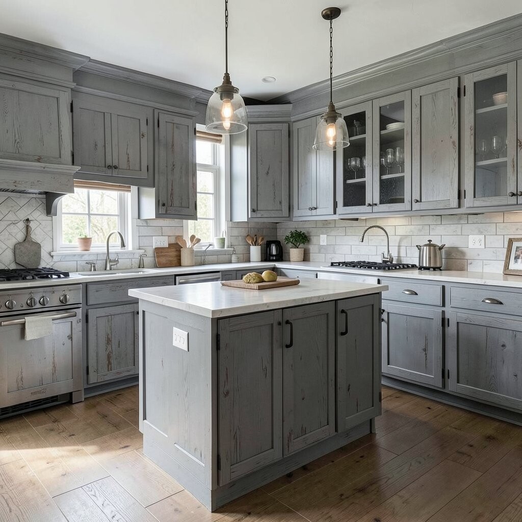 Distressed gray wood offers a rustic elegance that’s hard to beat. The weathered look adds character and depth to your kitchen.