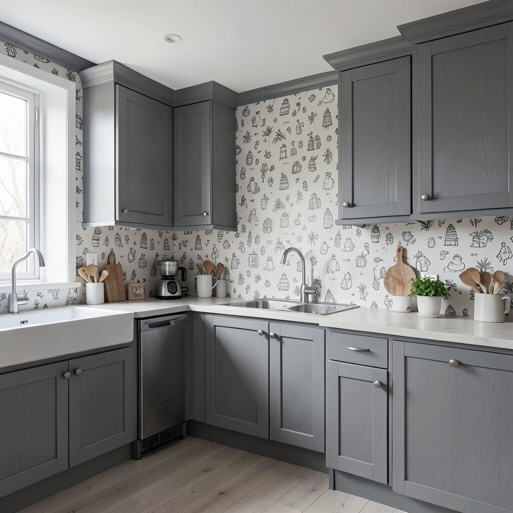 Combine gray wood with playful wallpaper patterns to create a unique kitchen design. This is a fun way to add personality to your space.