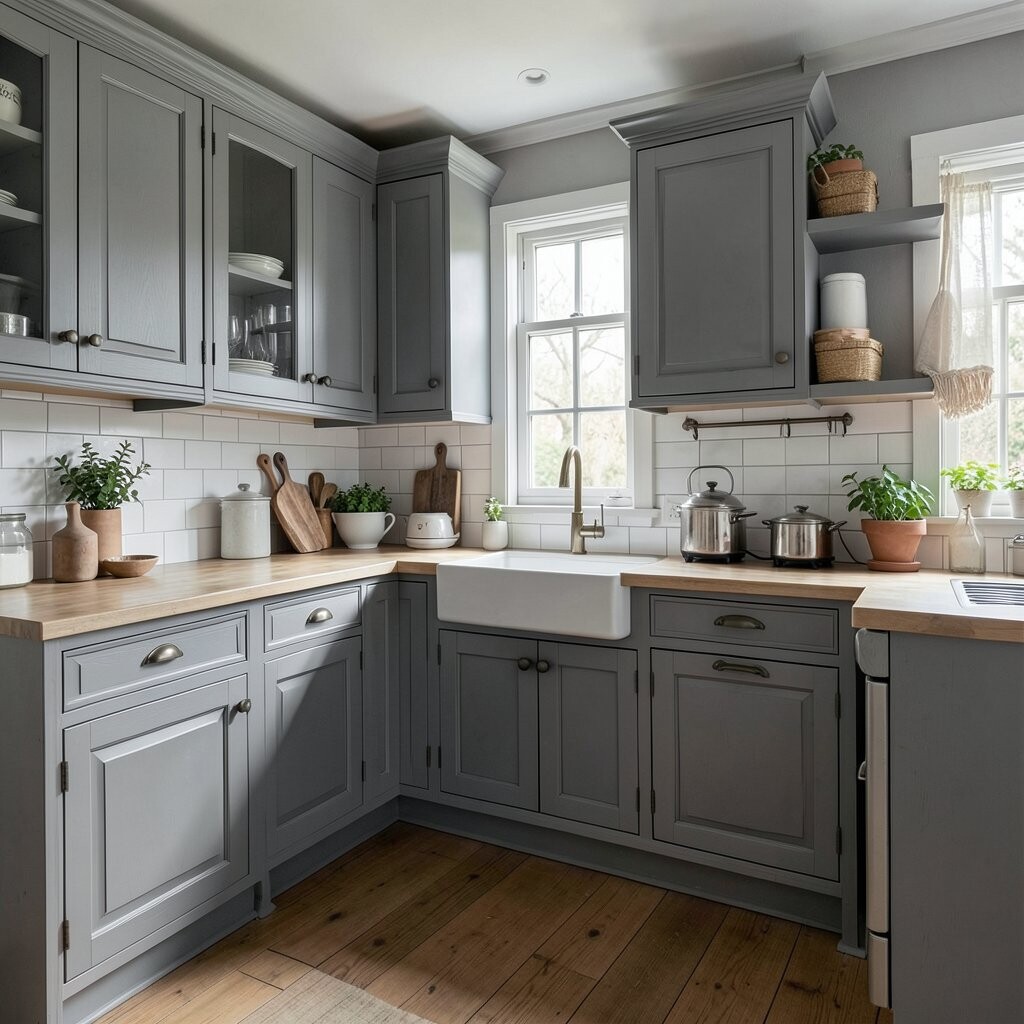 1. Vintage Charm with Gray Wooden Cabinets