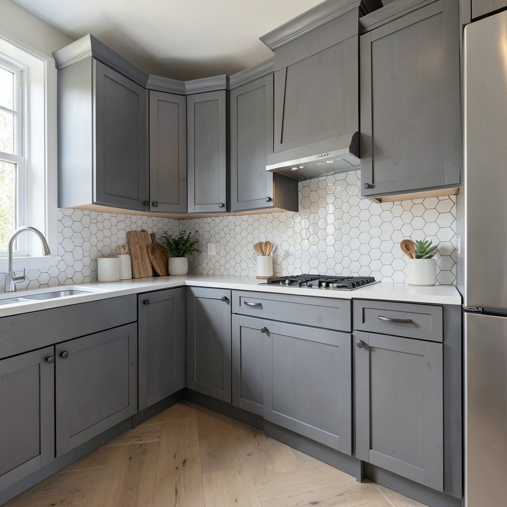 Combine gray wood with hexagonal tiles for a bold geometric design. This look is both trendy and eye-catching.
