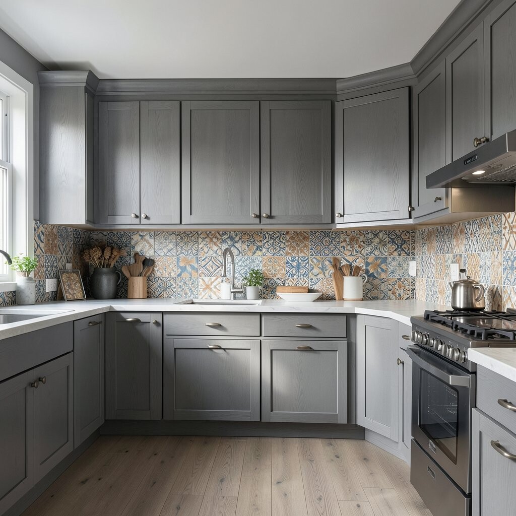 Using colorful tiles with gray wood can add an artistic flair to your kitchen. It’s a great way to express your creativity.