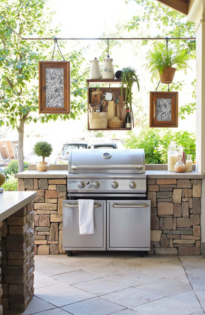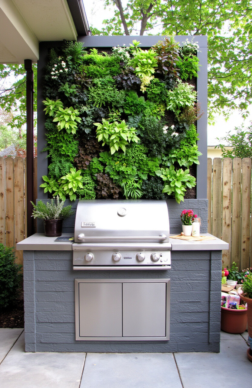 A vertical garden wall is a breathtaking addition that brings life and color to your grill corner. It’s perfect for small spaces and adds a lush backdrop to your outdoor kitchen. Choose a mix of succulents, ferns, or flowering plants for a dynamic look.