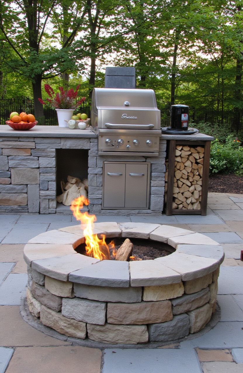 Add a cozy touch with a fire pit near your grill area. It’s perfect for roasting marshmallows or keeping warm on cool evenings. Choose a design that complements your outdoor space.