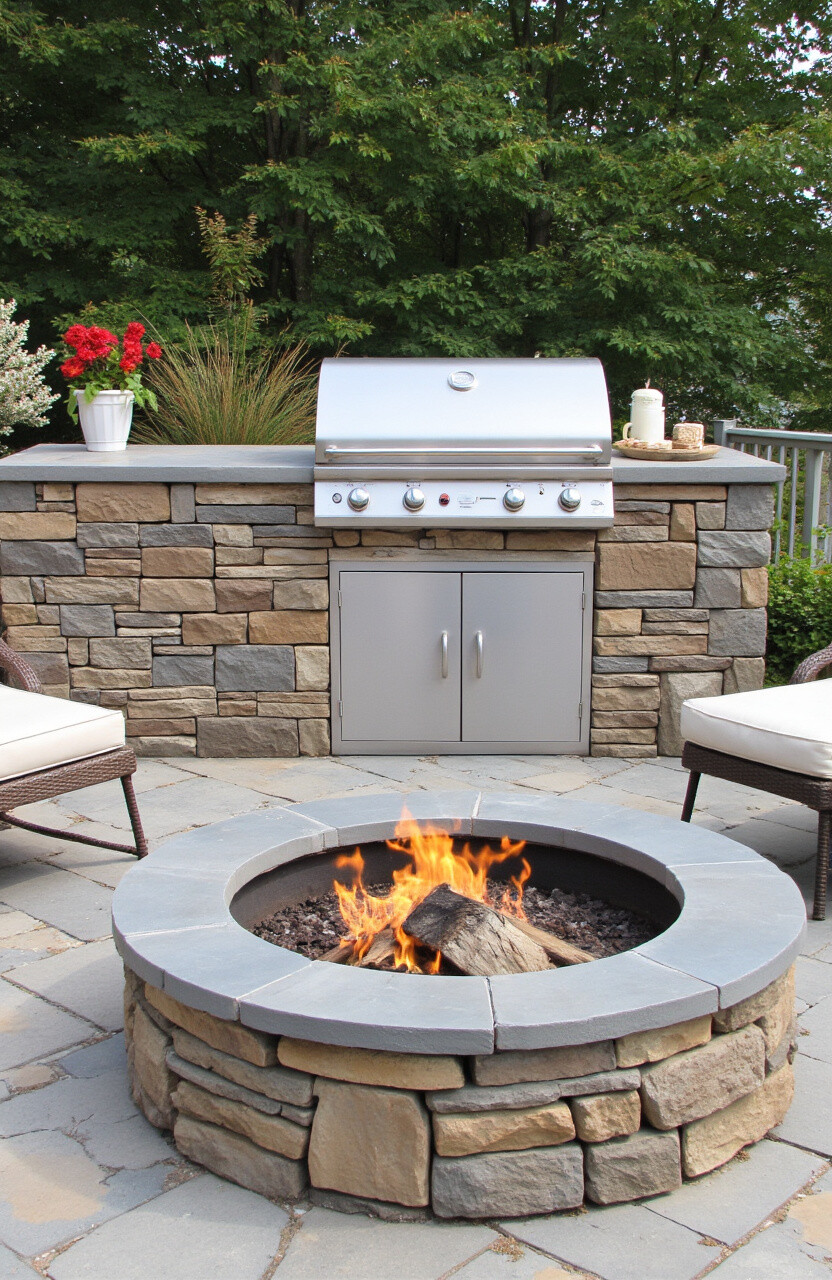 Add a fire pit nearby for warmth and ambiance. It’s the perfect spot for guests to gather around and relax after a meal.