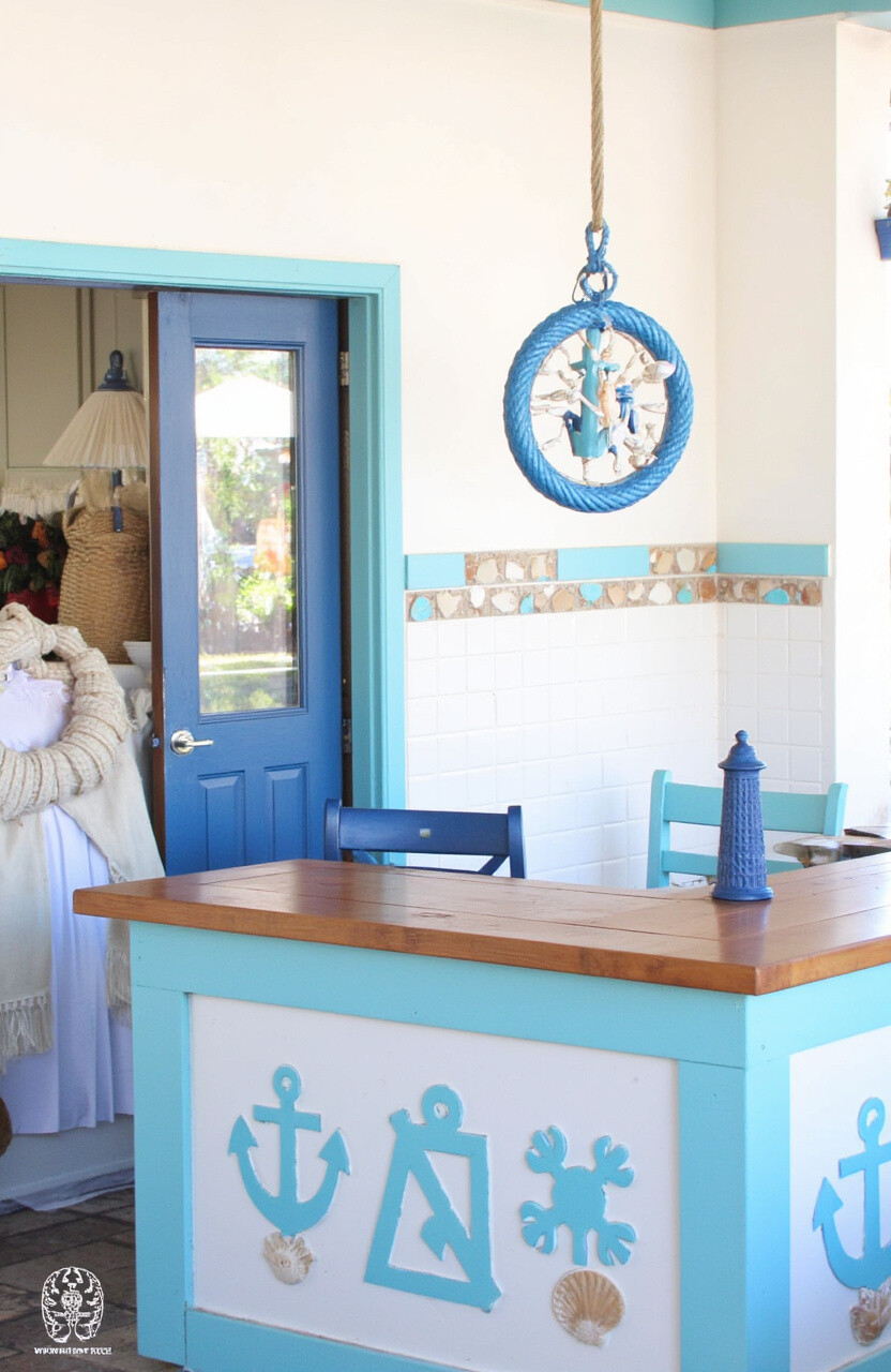 Create a seaside escape with a nautical theme. Use blue and white colors, rope accents, and seashell decor.