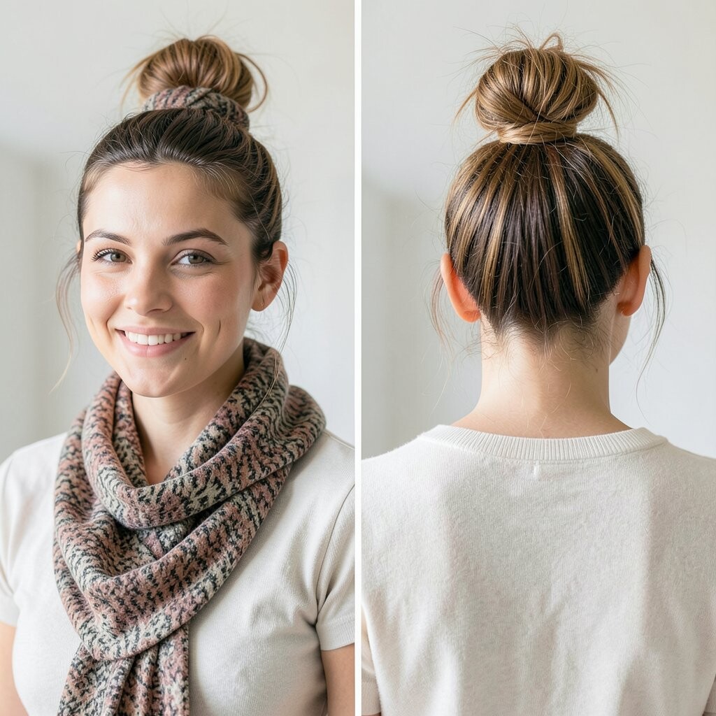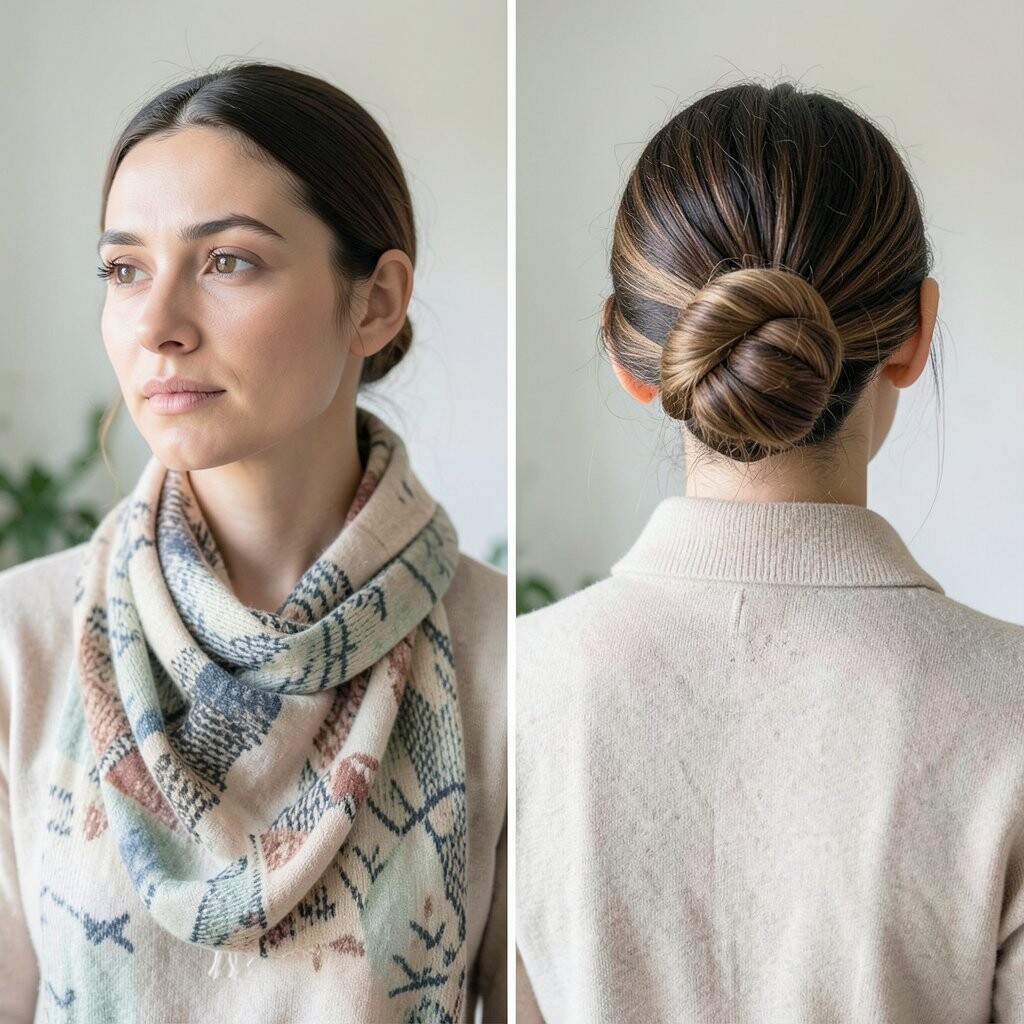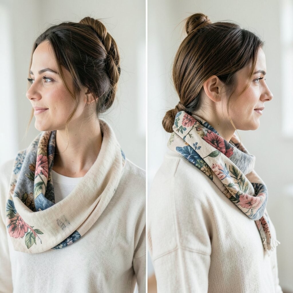 Wrap your scarf around a low bun for a sophisticated touch. It adds a hint of luxury.
