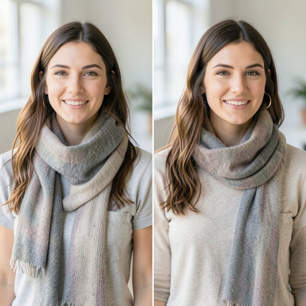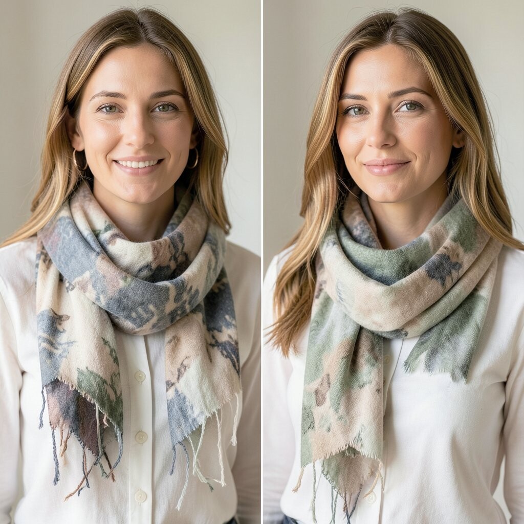 Wrap the scarf loosely and let it drape over your shoulders. It adds movement and elegance.