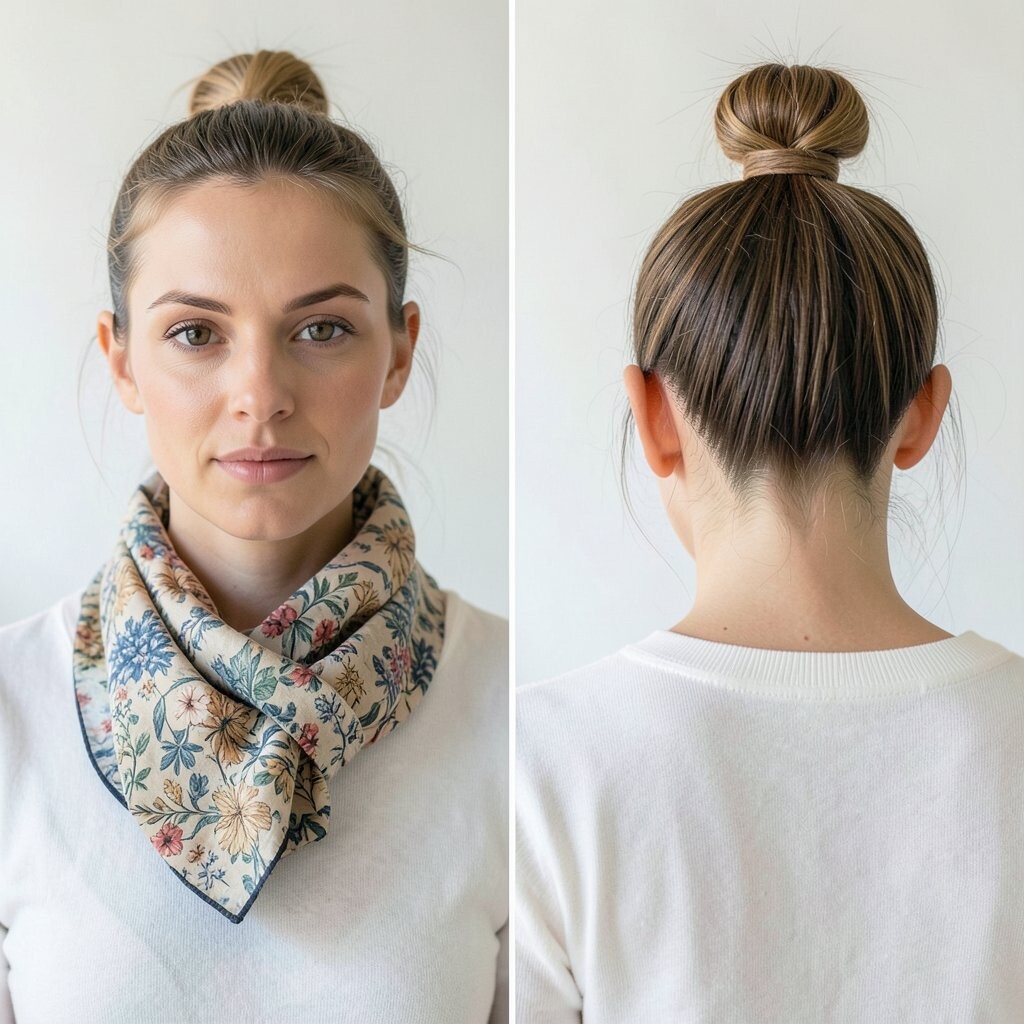 Wrap a scarf around your top knot for a polished look. It’s great for work or play.