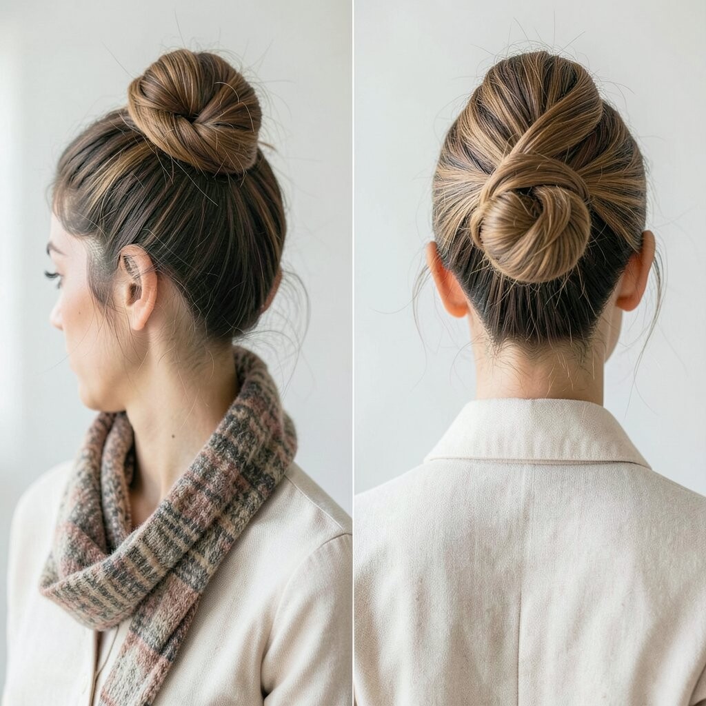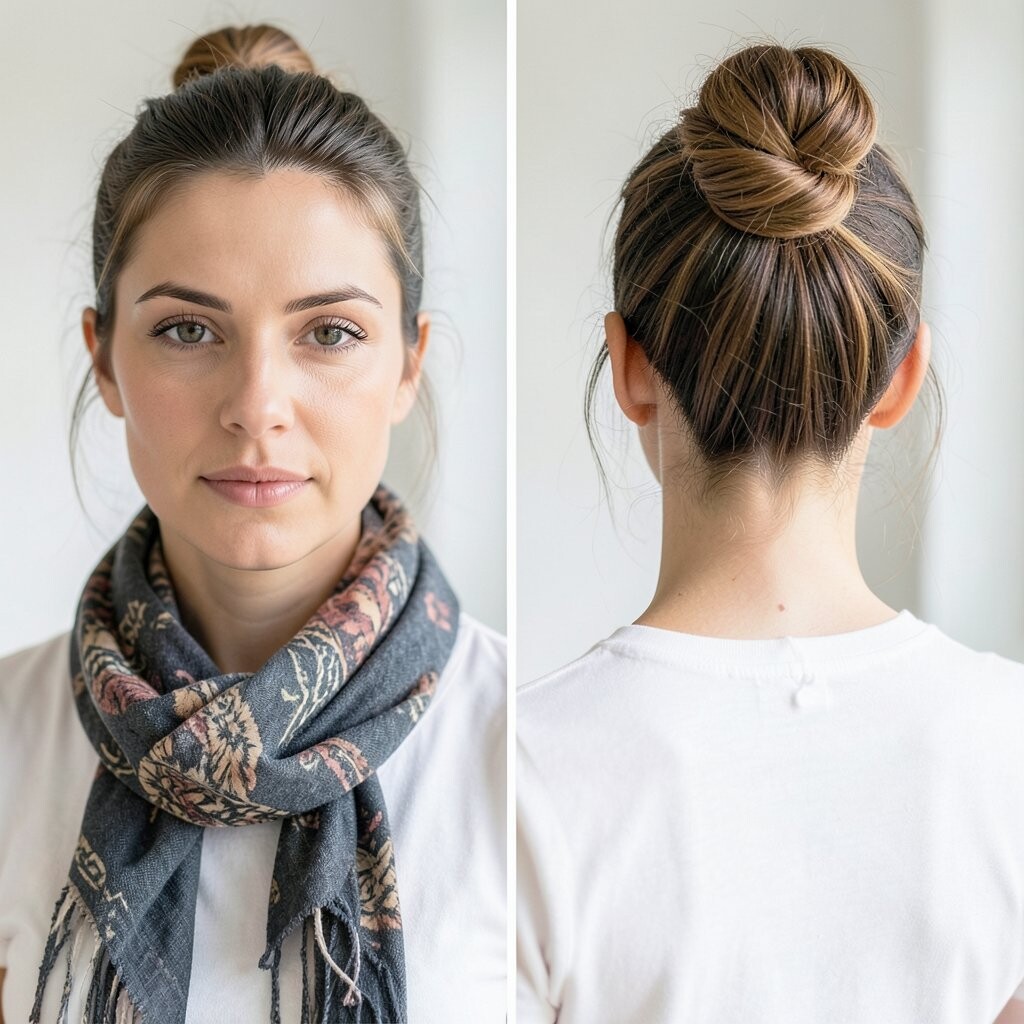 Twist a scarf around your bun for a unique touch. It adds texture and interest.