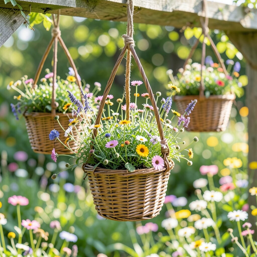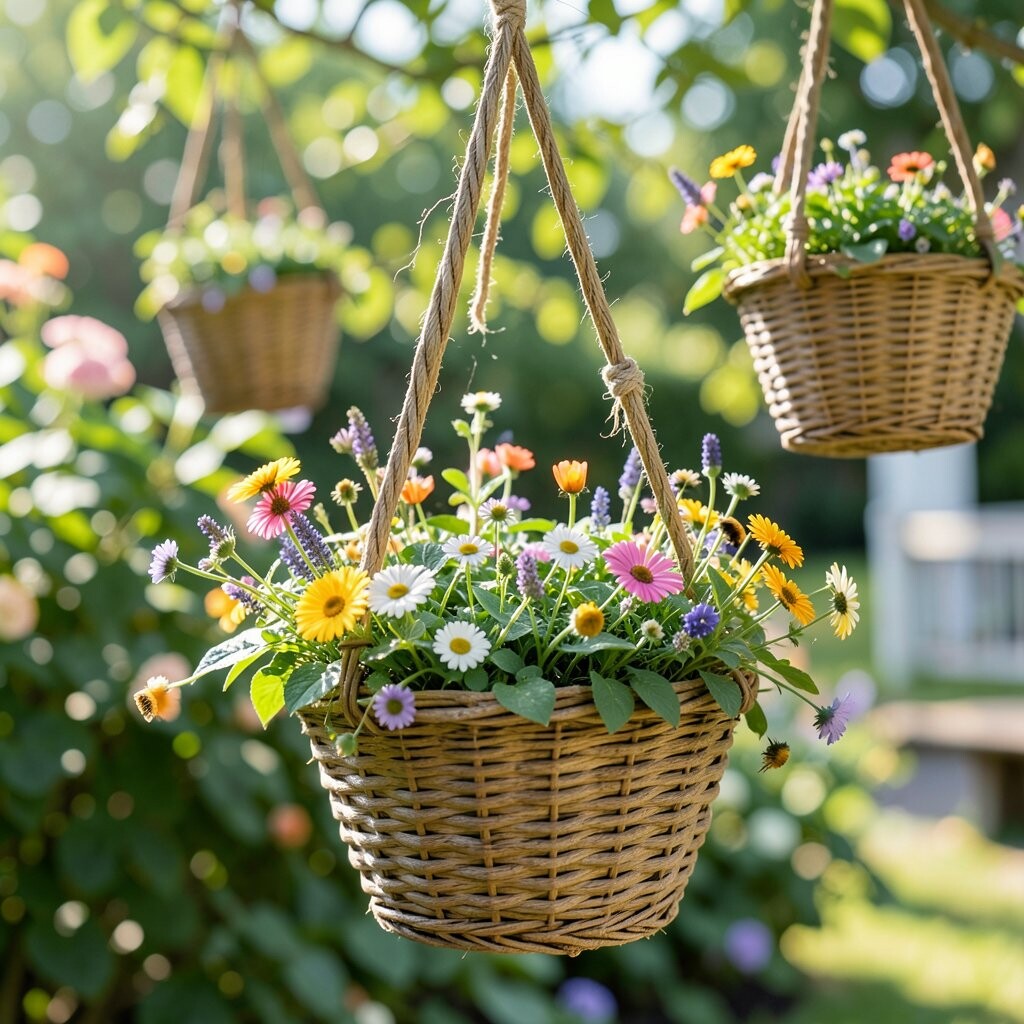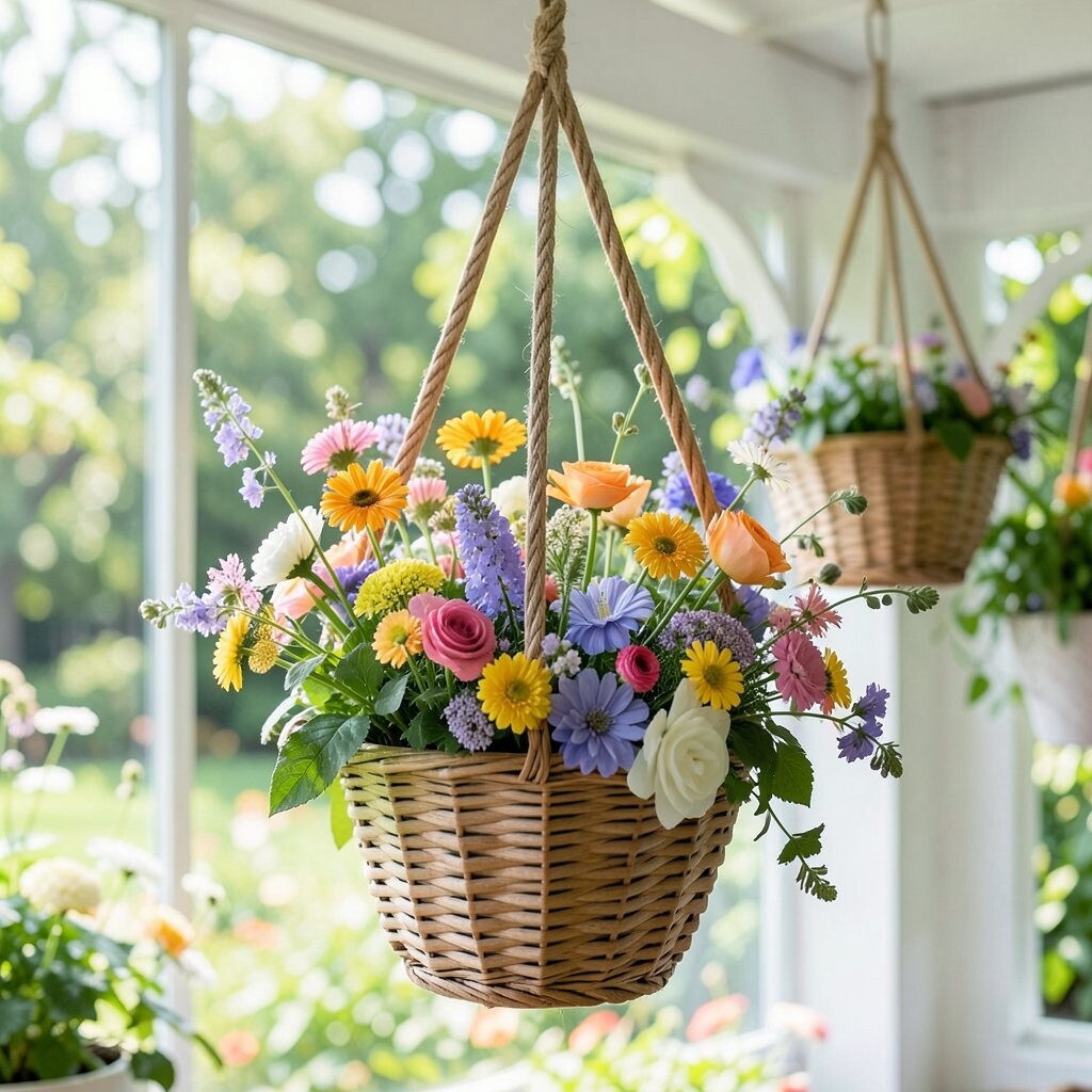 This basket looks loose, happy, and a little wild, with flowers that seem to dance in every direction. Think of daisies, cornflowers, and small blooms in mixed colors. It gives a fresh meadow feeling, even on a tiny porch.