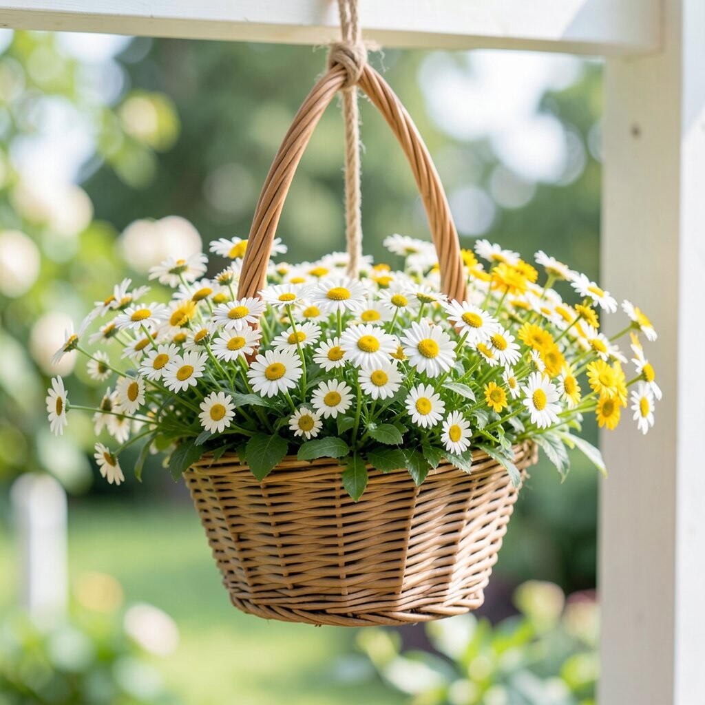 This basket feels happy and bright, filled with daisies in white, yellow, and soft pink. The flowers have a fresh, simple look that makes people smile right away. It works well in family gardens, front porches, and sunny patios.