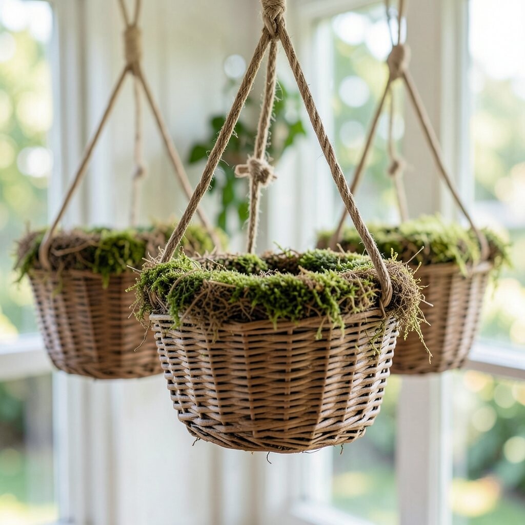 A moss-lined basket has a soft, woodland feel, with flowers or vines tucked into a green, natural-looking shell. It looks handmade and cozy, like something from a forest cottage. This style is lovely for gardeners who like a warm, earthy look.