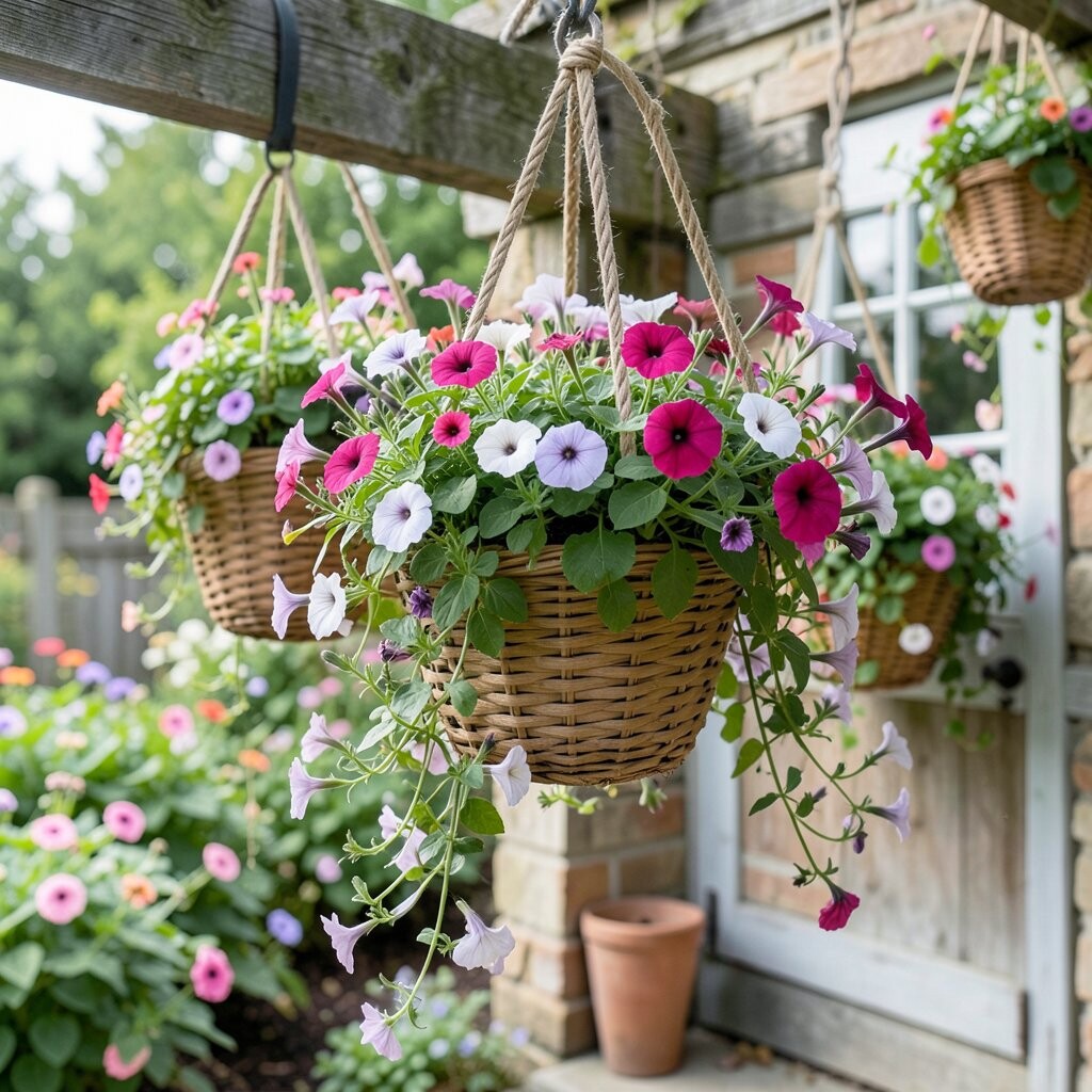 Picture a basket packed with petunias in pink, purple, and white, tumbling over the sides like soft ribbons. This look feels sweet, old-fashioned, and full of charm, almost like a storybook porch. It works well near doors, windows, and garden gates where people can enjoy the blooms up close.