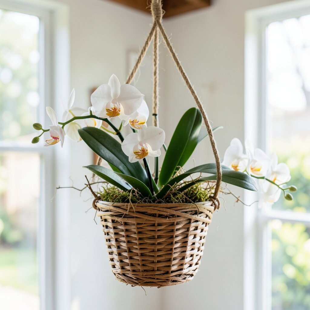 The benefit is the long-lasting blooms, which can make the display feel luxurious for weeks. Its uniqueness comes from the tall stems and smooth flowers that look very sleek. A stylish trend is to use a simple white or black basket so the orchid’s shape gets all the attention.
