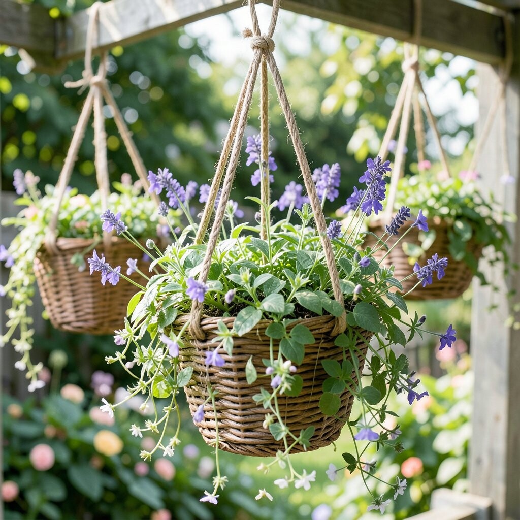 Lavender in a hanging basket is soft, pretty, and calm, with silvery leaves and purple flower spikes. It looks elegant and smells amazing, almost like a tiny spa in the air. This basket fits well in sunny spots where you want beauty and scent together.
