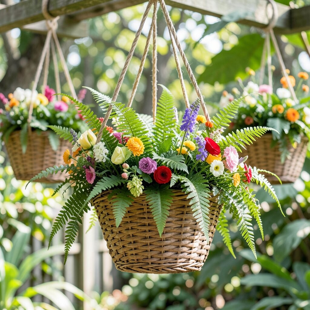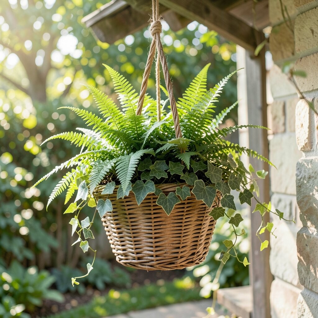 This basket feels cool, calm, and soft, with feathery ferns and trailing ivy making a leafy curtain. The greens look rich and restful, which is lovely for a shady porch or under a tree. It gives a neat, polished look without needing bright flowers.