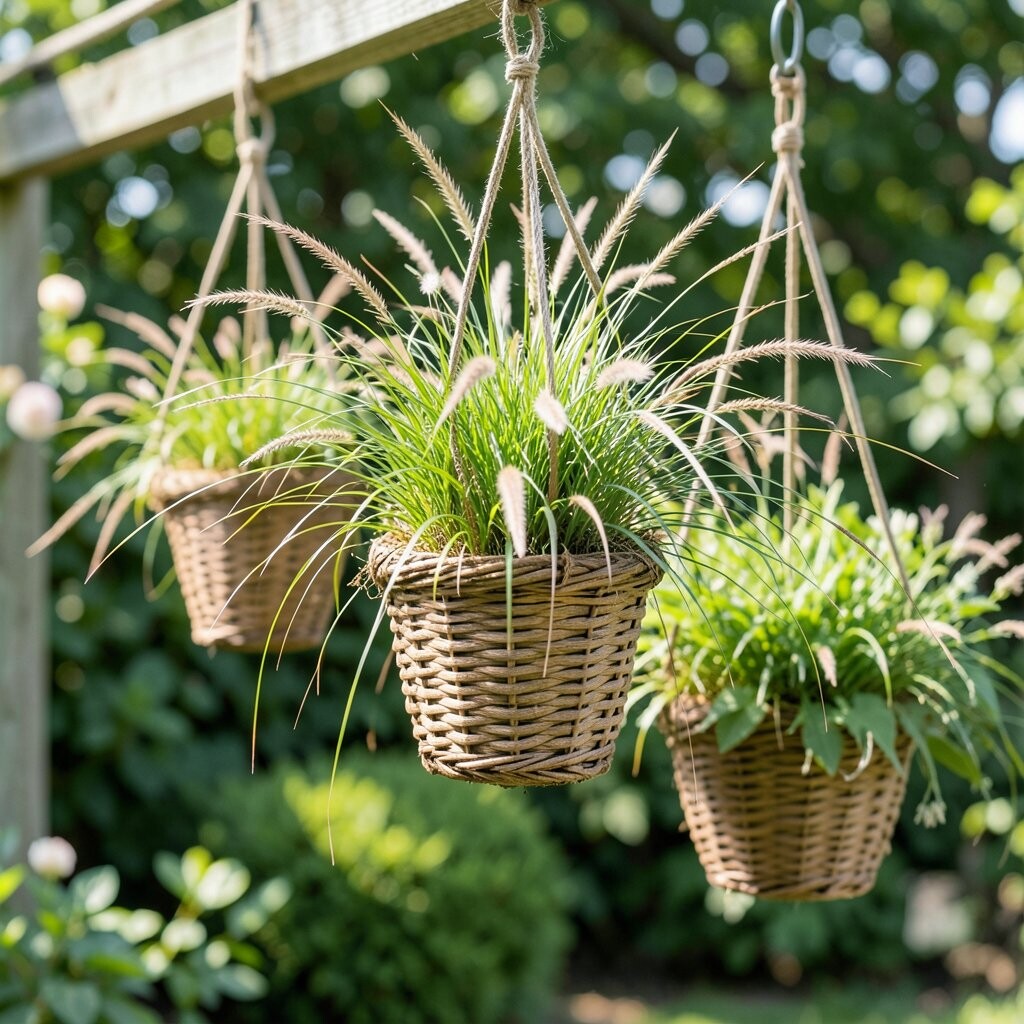 The benefit is texture, since the grass adds motion and shape without needing many flowers. Its uniqueness comes from the airy, fountain-like look that feels fresh and stylish. A trend people enjoy is mixing grass with one small flowering plant for a soft, sculpted basket.