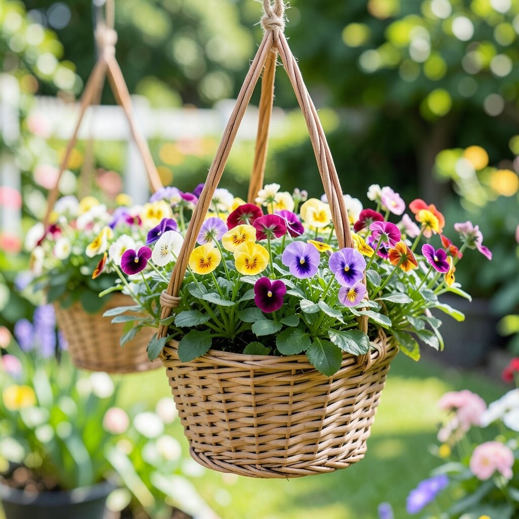 Pansies bring sweet little faces in purple, yellow, blue, and orange. Hanging together, they make a basket look cheerful and neat, almost like a row of tiny painted smiles. They are especially pretty in cooler weather when many other flowers slow down.