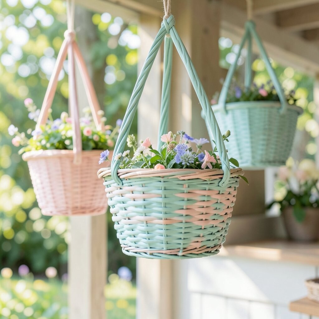 Pastel baskets feel gentle and sweet, with colors like blush pink, pale blue, lavender, and creamy yellow. The whole look is soft as cotton candy and very easy to love. It is a lovely choice for spring porches, baby showers, or calm garden corners.