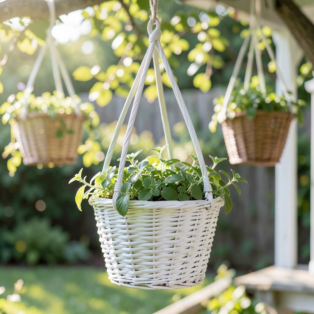 A white hanging basket feels soft, clean, and calm, like a little cloud in the garden. White flowers such as alyssum, bacopa, and white petunias can make the whole basket glow. This style looks lovely at dusk, when the pale blooms seem to shine.