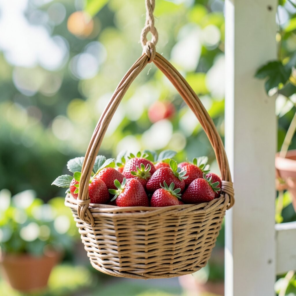 A hanging strawberry basket is both pretty and useful, with white flowers, green leaves, and tiny red fruit peeking out. It looks cheerful and fresh, like a snack and a decoration all in one. Kids and grown-ups both love seeing the berries hang above eye level.