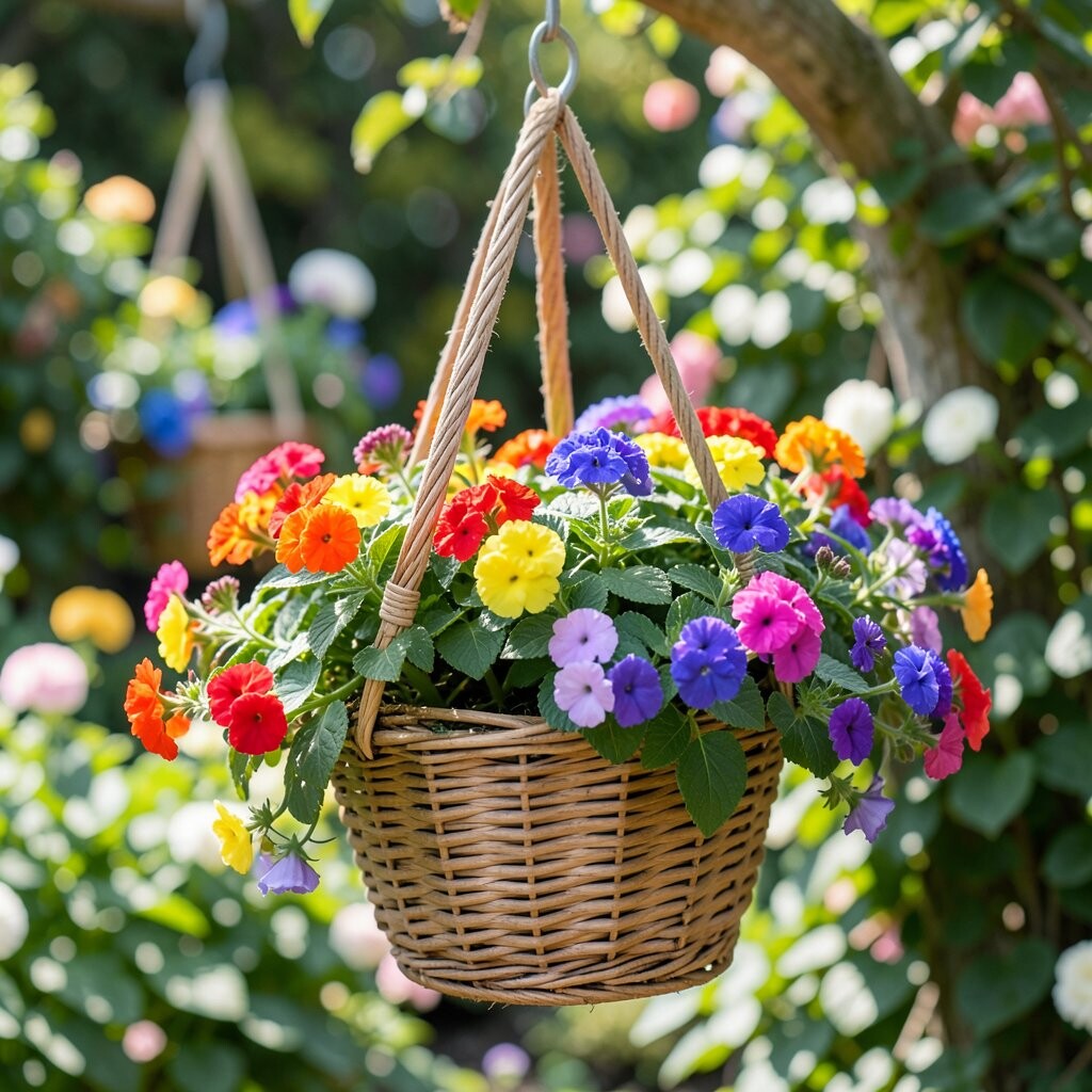 Place it in full sun so the colors stay strong and bright. You can make it your own by using a copper or terracotta hanger. The cost is low to moderate, depending on the flowers you choose and how full you want the basket.
