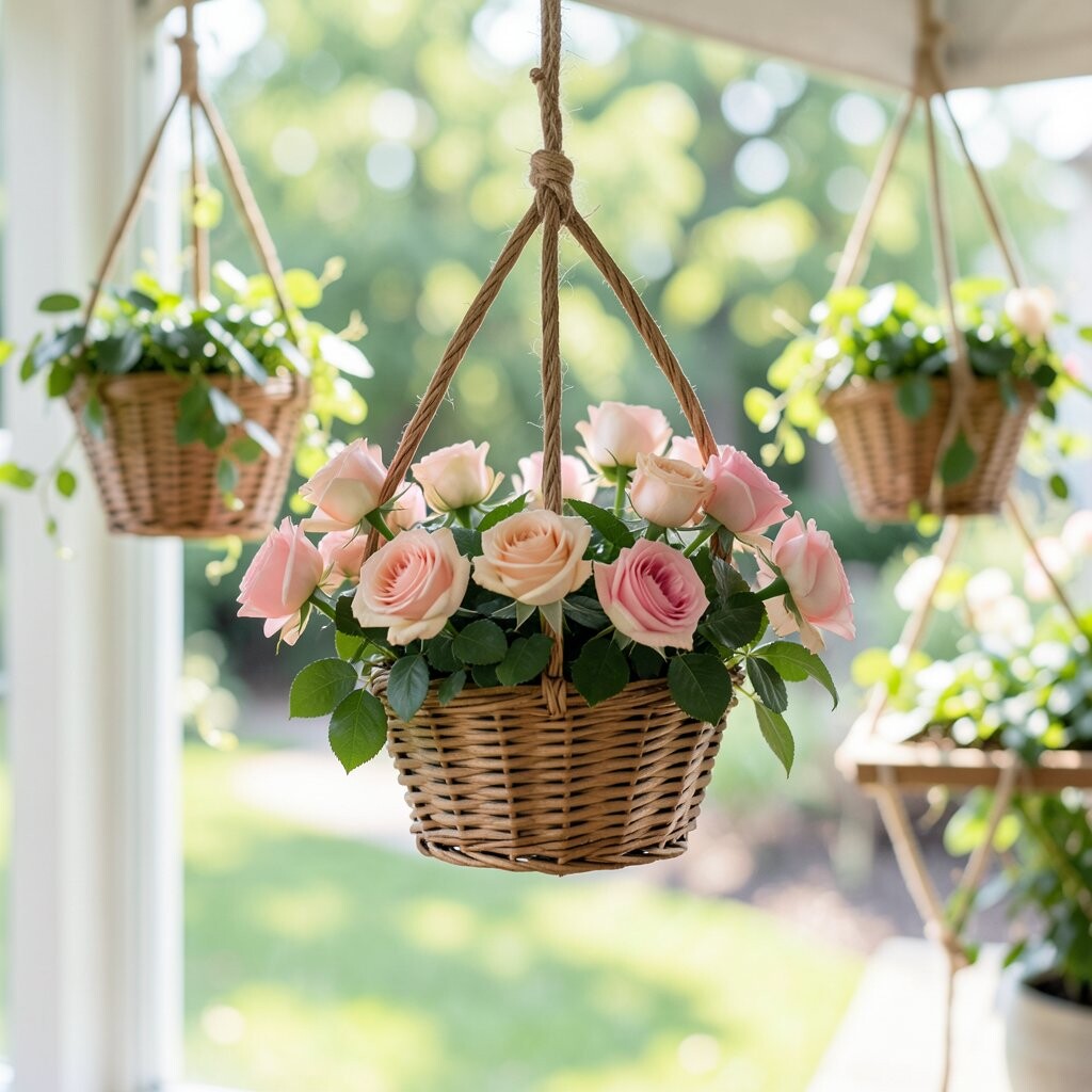 Mini roses in a hanging basket look sweet and full of charm, with tiny blooms in red, pink, yellow, or cream. The petals feel delicate, but the whole basket can still look bold and rich. It is a lovely pick for a romantic porch or a cozy sitting area.