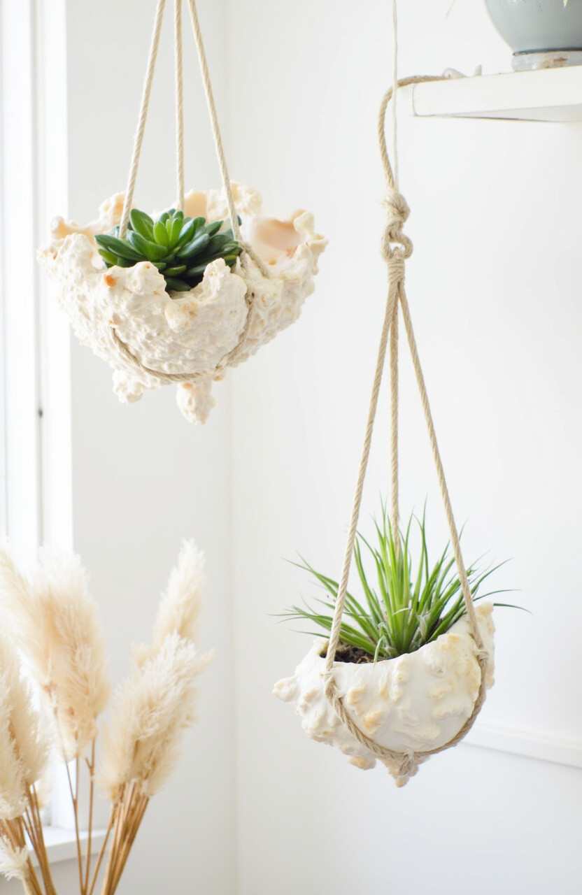 They’re perfect for air plants and add a touch of whimsy. This idea is great for ocean lovers and brings a bit of the seaside indoors.