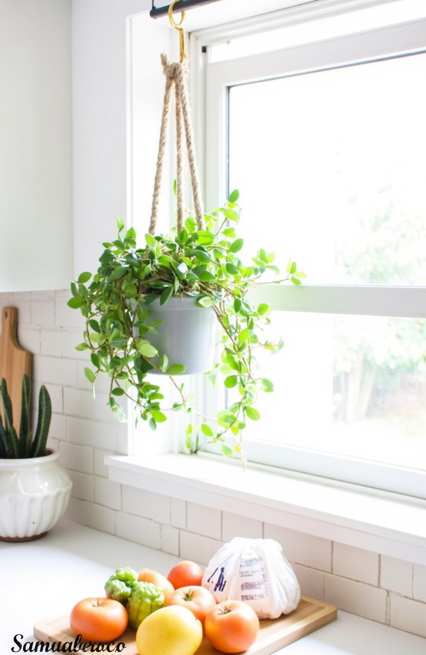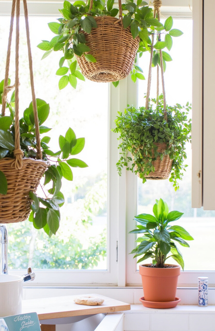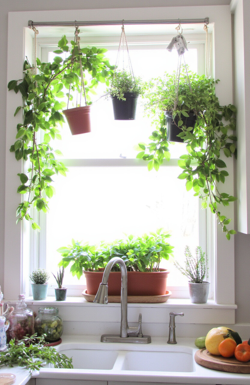 Utilize a curtain rod to hang plants in front of your kitchen window. This creates a green curtain that filters light beautifully.
