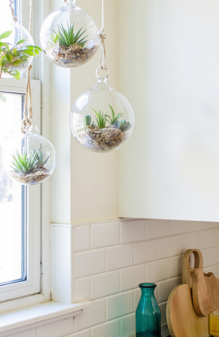Glass terrariums are a stunning way to display small plants. Hang them near your kitchen windows to catch the light, creating dazzling reflections.