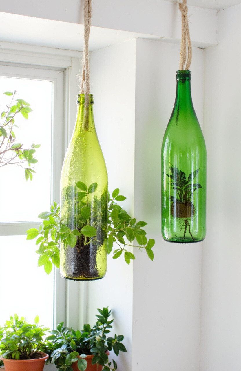 Repurpose glass bottles into hanging planters. Hang them upside down and watch as the plants thrive in these unique containers.